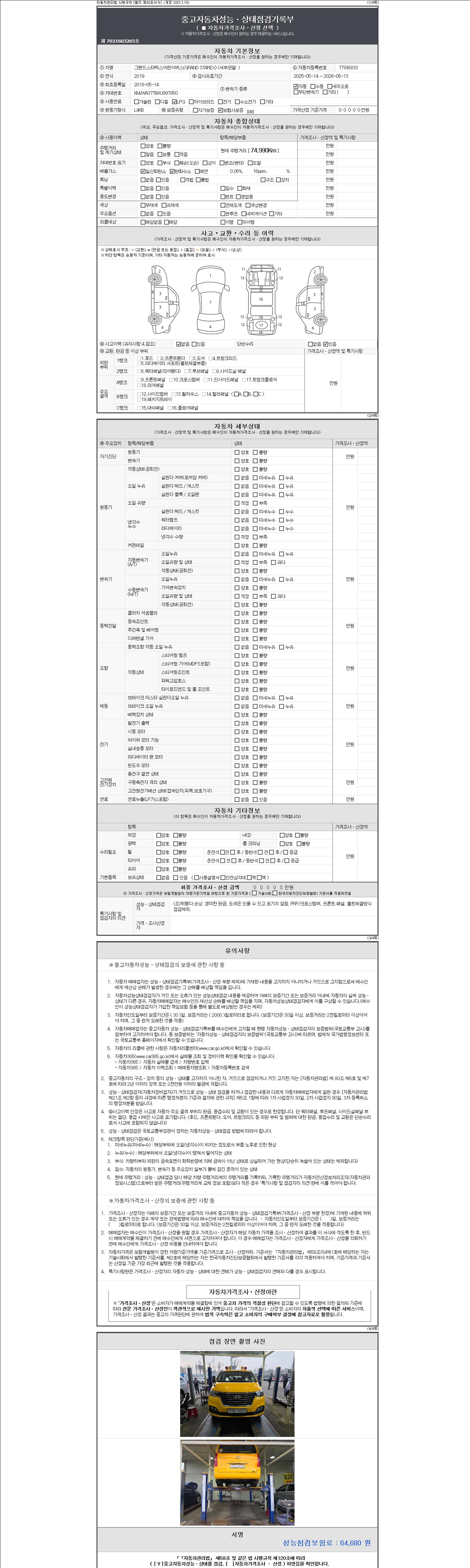 | 주행거리 | 74,990 km | 차량번호 | 77러6833 | 사고유무 | 성능기록부 참조 | 제시번호 | 제 2147483647 호 |