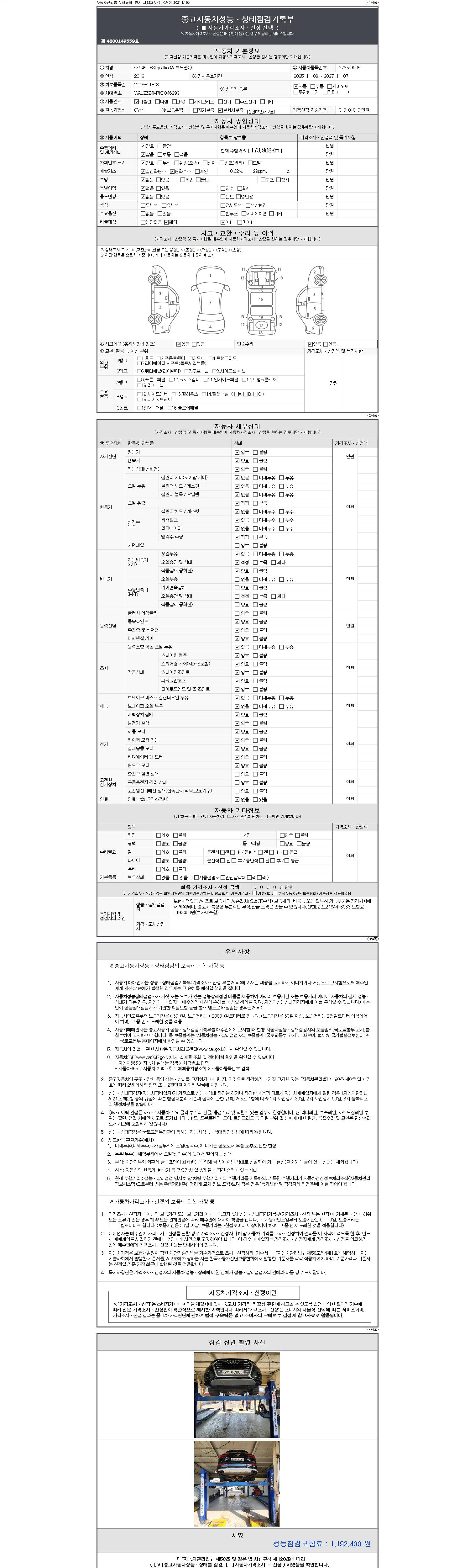 자동차관리법 시행규칙 제120조의 규정에 따라 별지 제 82호서식 《중고자동차 성능, 상태점검 기록부》를 발행한 성능, 상태점검자 및 매매자는 아래의 보증기간 또는 보증거리 이내의 중고자동차, 성능점검 기록부에 기재된 내용과 자동차의 실제 성능, 상태가 다른 경우 계약 또는 관계법령에 따라 매수인에 대하여 책임을 집니다.