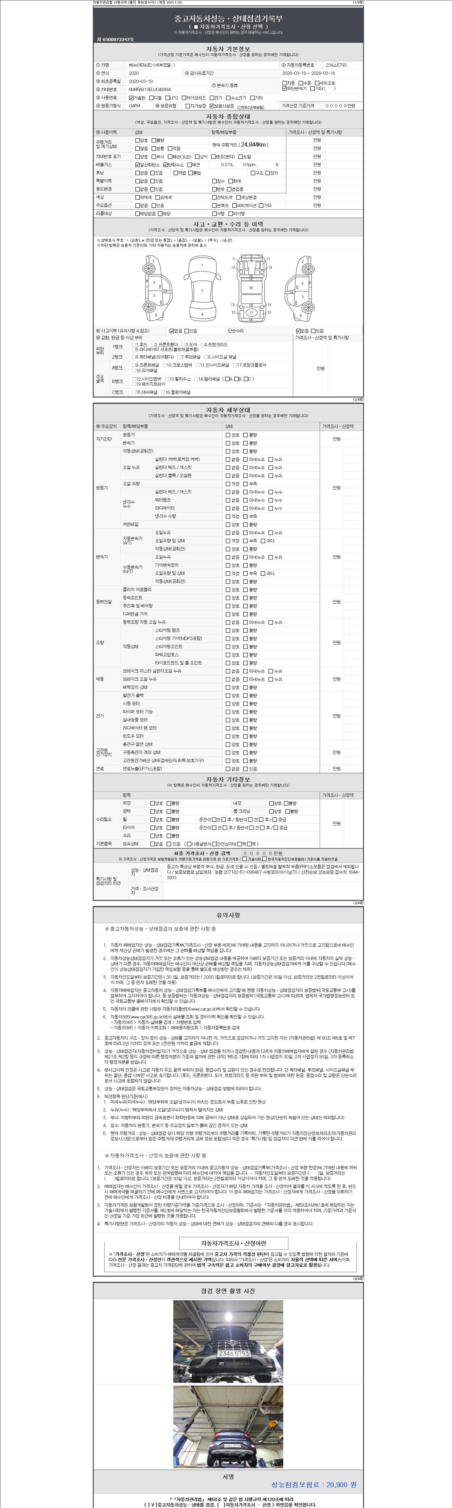 | 주행거리 | 24,844 km | 차량번호 | 234소5793 | 사고유무 | 성능기록부 참조 | 제시번호 | 제 2147483647 호 |