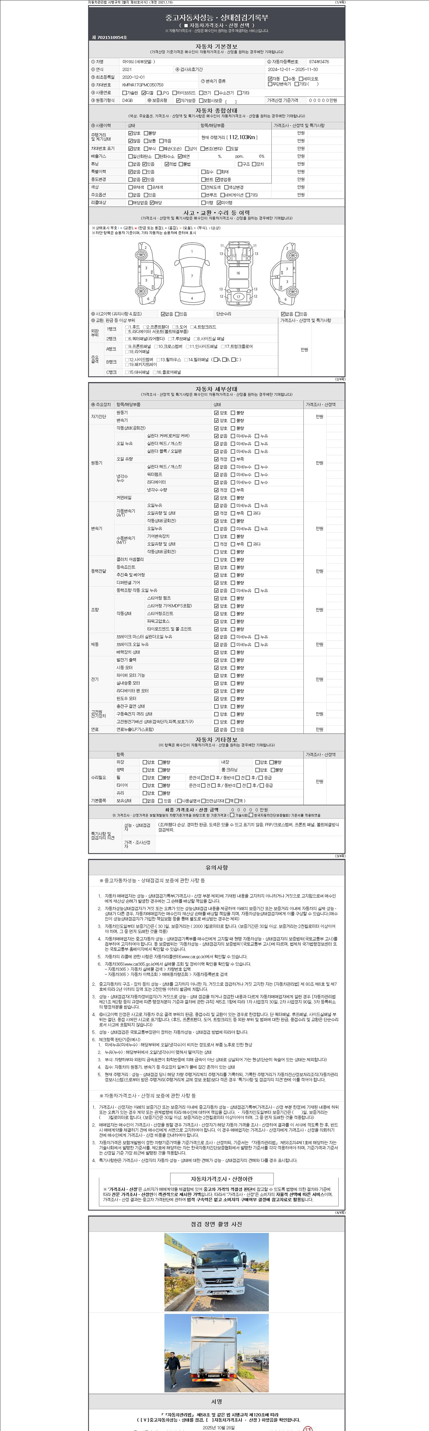 자동차관리법 시행규칙 제120조의 규정에 따라 별지 제 82호서식 《중고자동차 성능, 상태점검 기록부》를 발행한 성능, 상태점검자 및 매매자는 아래의 보증기간 또는 보증거리 이내의 중고자동차, 성능점검 기록부에 기재된 내용과 자동차의 실제 성능, 상태가 다른 경우 계약 또는 관계법령에 따라 매수인에 대하여 책임을 집니다.