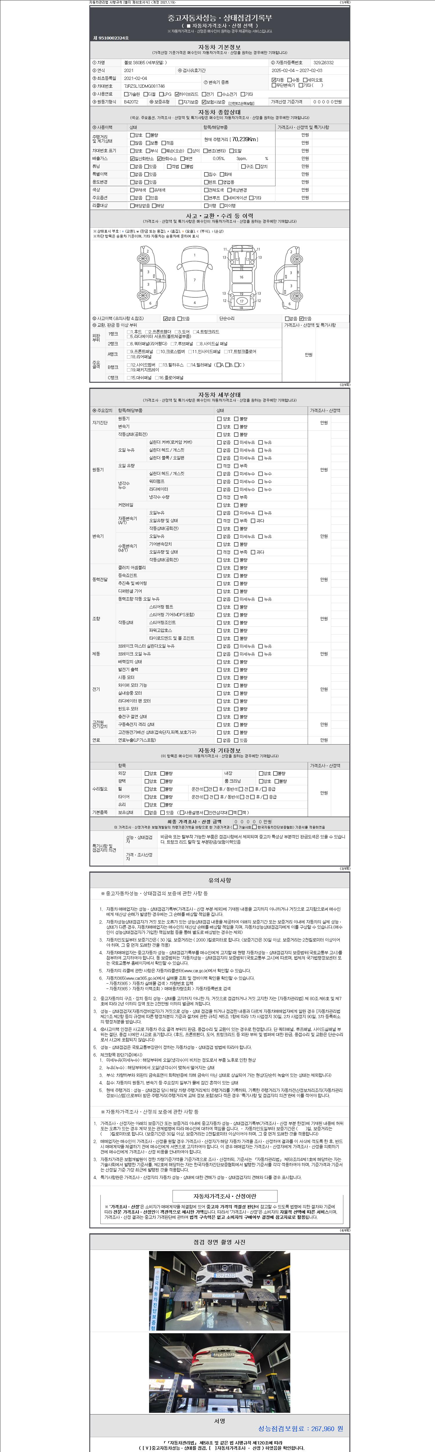 자동차관리법 시행규칙 제120조의 규정에 따라 별지 제 82호서식 《중고자동차 성능, 상태점검 기록부》를 발행한 성능, 상태점검자 및 매매자는 아래의 보증기간 또는 보증거리 이내의 중고자동차, 성능점검 기록부에 기재된 내용과 자동차의 실제 성능, 상태가 다른 경우 계약 또는 관계법령에 따라 매수인에 대하여 책임을 집니다.