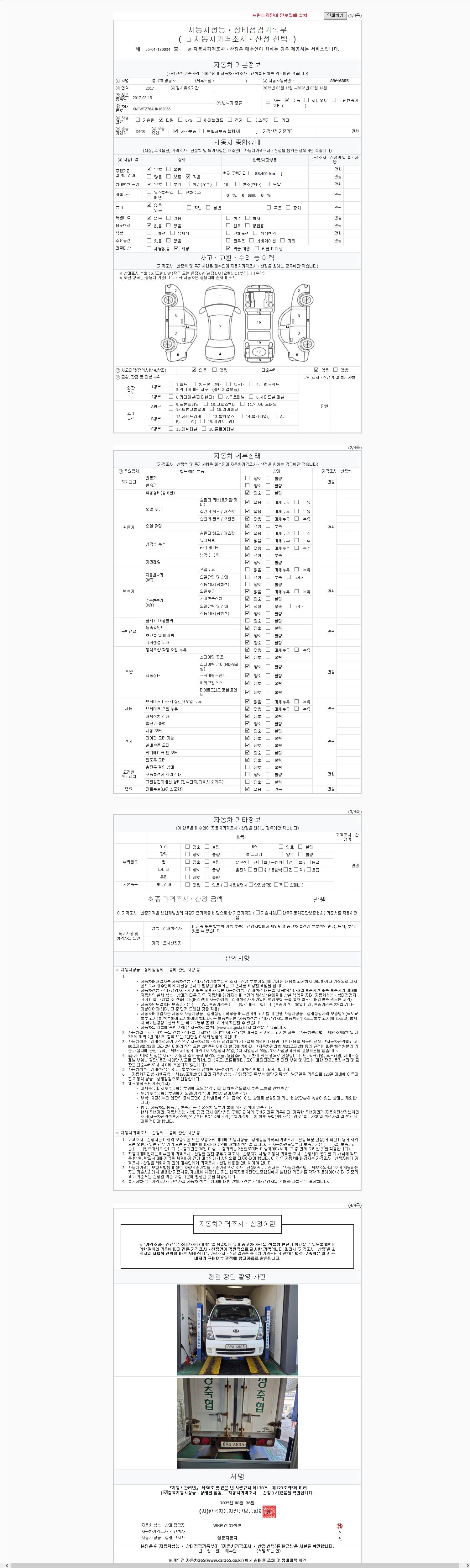 주행거리 88,401 km 차량번호 89러6805 사고유무 성능기록부 참조 제시번호 제 2147483647 호