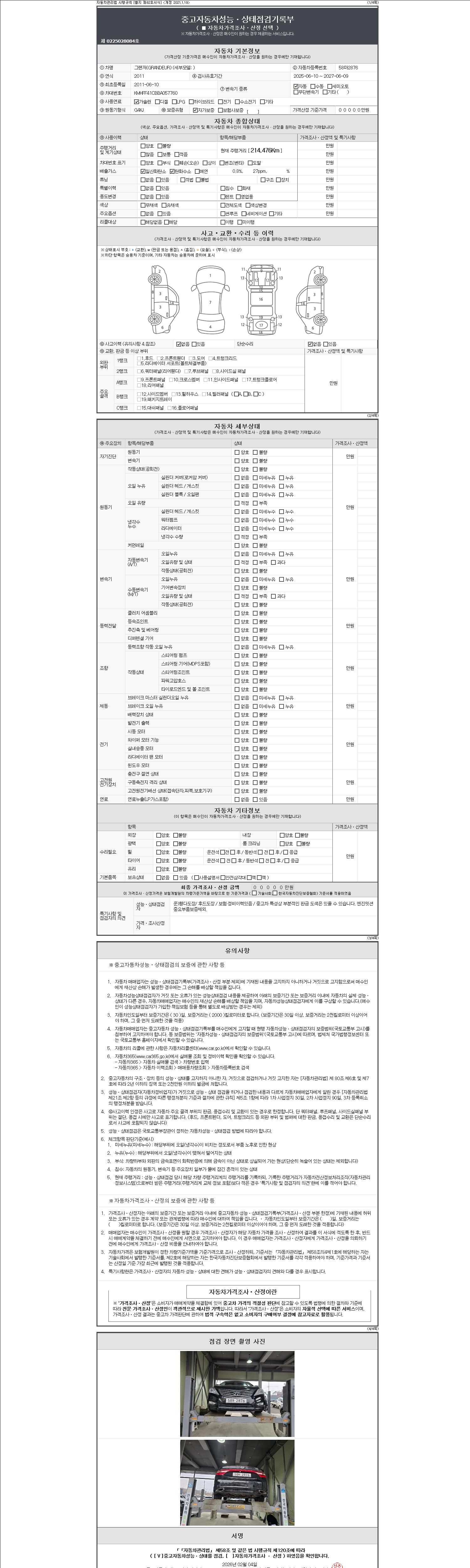자동차관리법 시행규칙 제120조의 규정에 따라 별지 제 82호서식 《중고자동차 성능, 상태점검 기록부》를 발행한 성능, 상태점검자 및 매매자는 아래의 보증기간 또는 보증거리 이내의 중고자동차, 성능점검 기록부에 기재된 내용과 자동차의 실제 성능, 상태가 다른 경우 계약 또는 관계법령에 따라 매수인에 대하여 책임을 집니다.