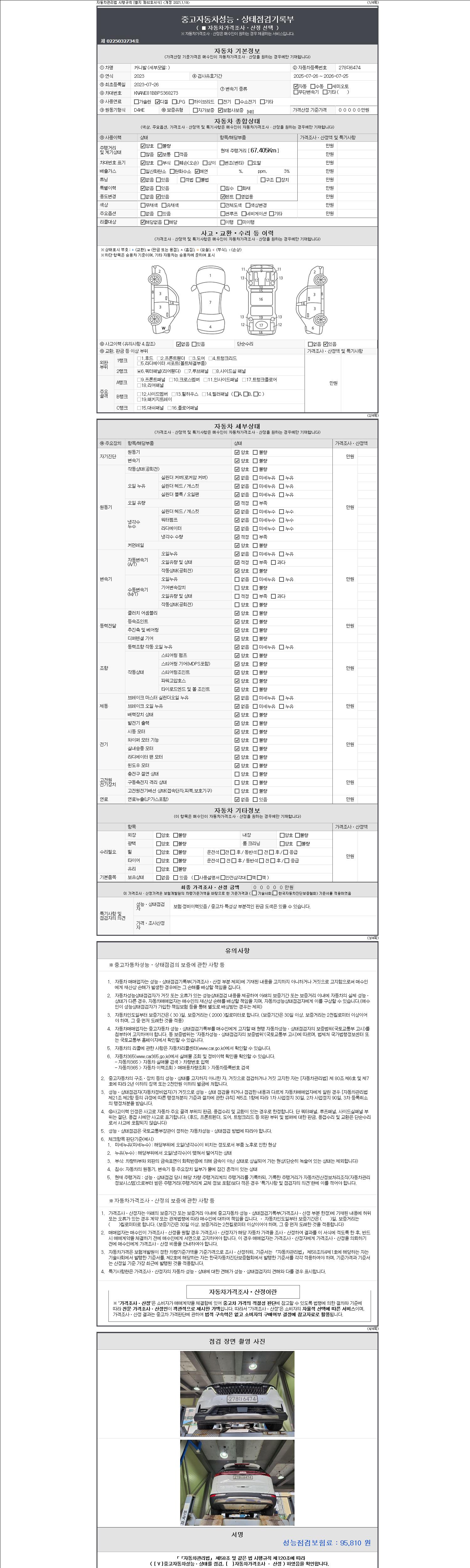 | 주행거리 | 67,405 km | 차량번호 | 278더6474 | 사고유무 | 성능기록부 참조 | 제시번호 | 제 2147483647 호 |