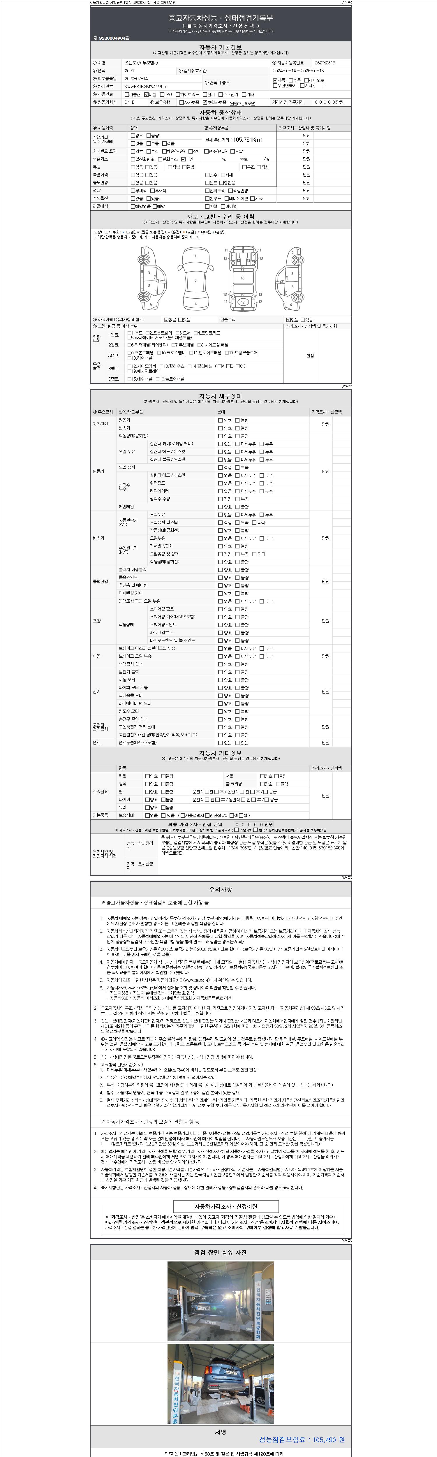 | 주행거리 | 105,751 km | 차량번호 | 262거2315 | 사고유무 | 성능기록부 참조 | 제시번호 | 제 2147483647 호 |