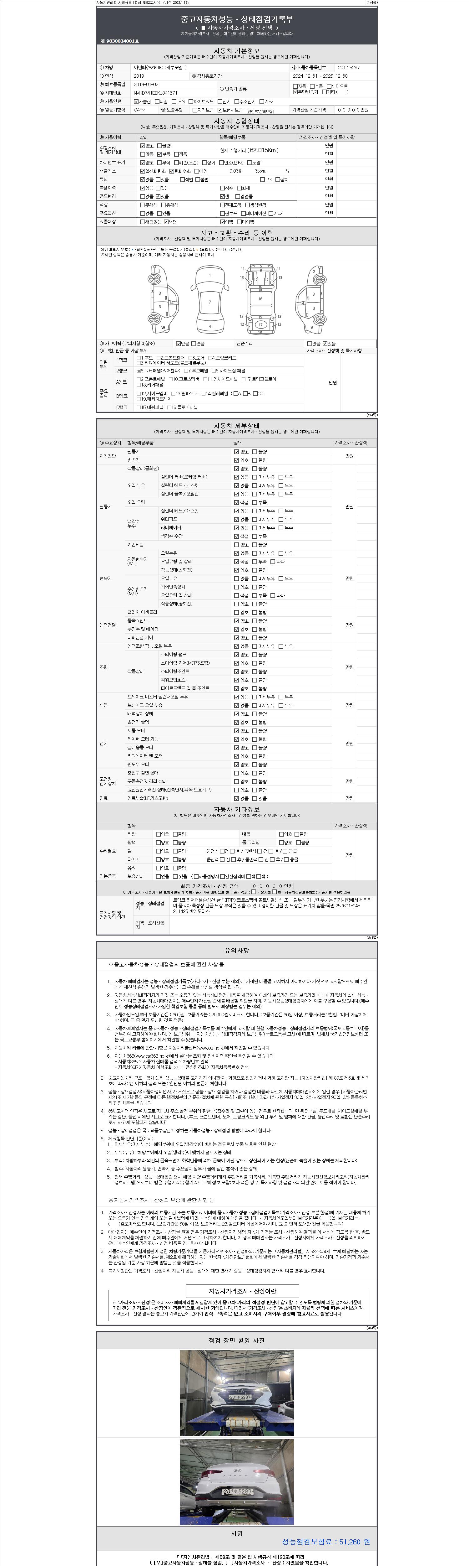 | 주행거리 | 62,015 km | 차량번호 | 201수5287 | 사고유무 | 성능기록부 참조 | 제시번호 | 제 2147483647 호 |