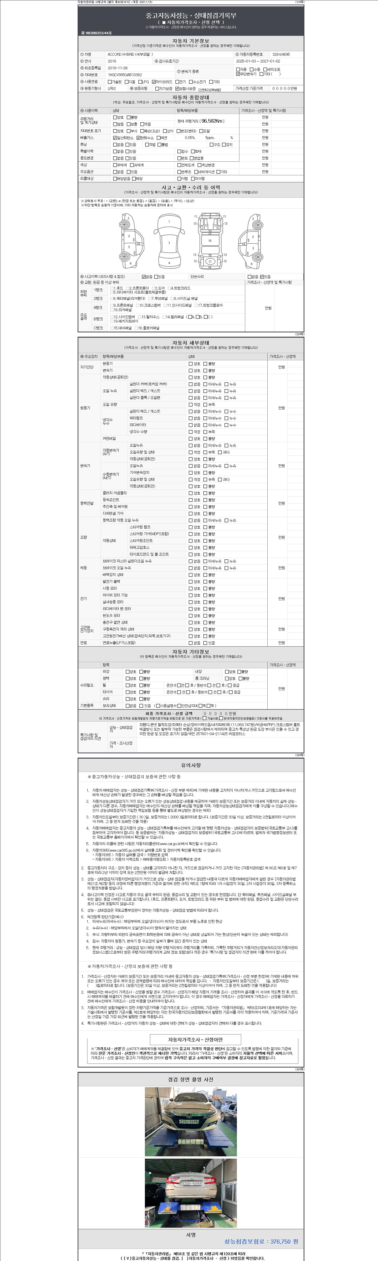 | 주행거리 | 96,580 km | 차량번호 | 328수9695 | 사고유무 | 성능기록부 참조 | 제시번호 | 제 2147483647 호 |
