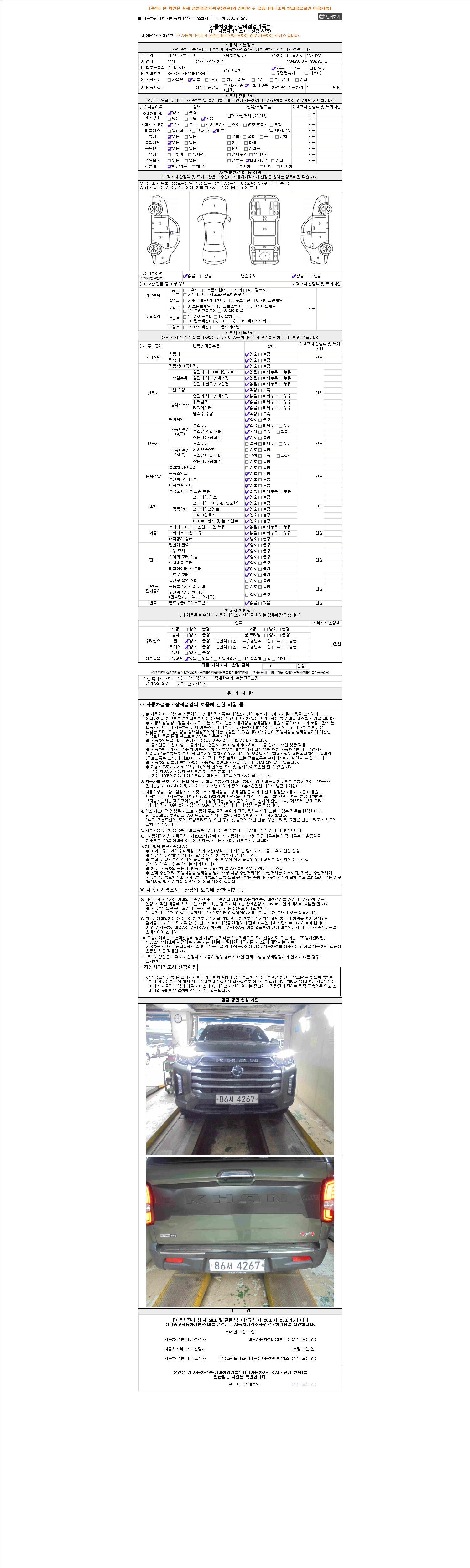 | 주행거리 | 43,915 km | 차량번호 | 86서4267 | 사고유무 | 성능기록부 참조 | 제시번호 | 제 2026020159 호 |