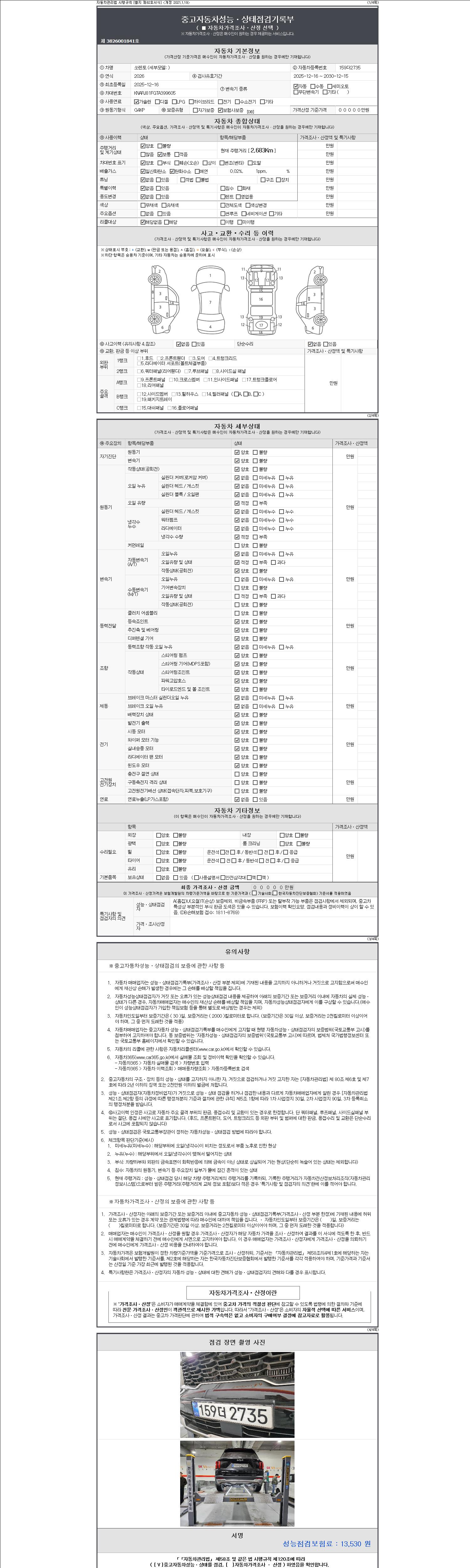 자동차관리법 시행규칙 제120조의 규정에 따라 별지 제 82호서식 《중고자동차 성능, 상태점검 기록부》를 발행한 성능, 상태점검자 및 매매자는 아래의 보증기간 또는 보증거리 이내의 중고자동차, 성능점검 기록부에 기재된 내용과 자동차의 실제 성능, 상태가 다른 경우 계약 또는 관계법령에 따라 매수인에 대하여 책임을 집니다.