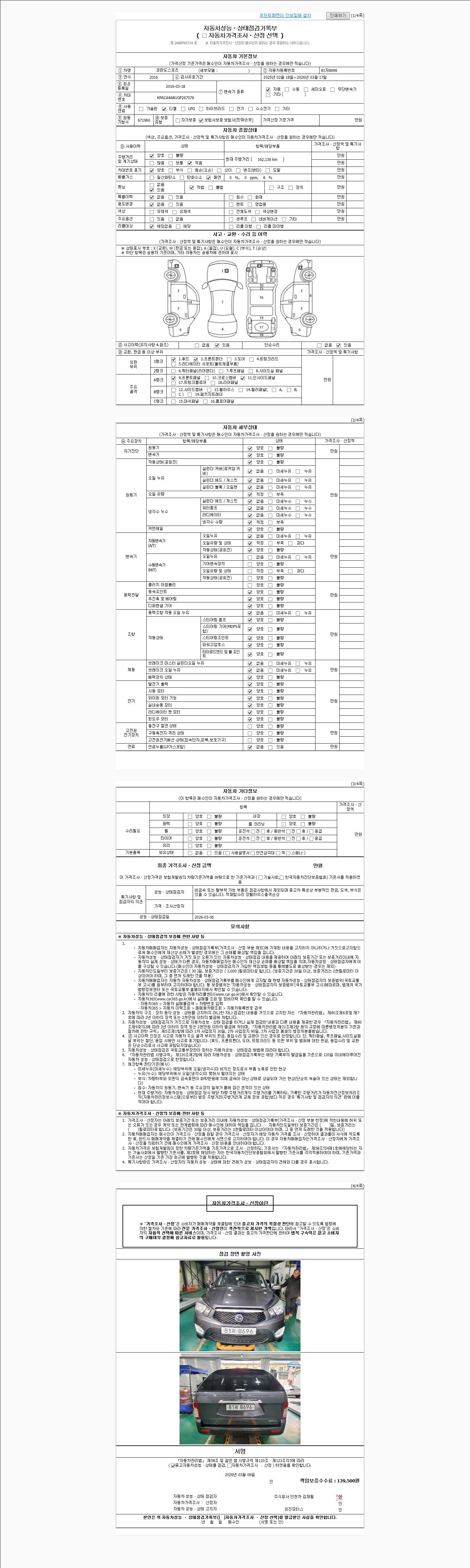 자동차관리법 시행규칙 제120조의 규정에 따라 별지 제 82호서식 《중고자동차 성능, 상태점검 기록부》를 발행한 성능, 상태점검자 및 매매자는 아래의 보증기간 또는 보증거리 이내의 중고자동차, 성능점검 기록부에 기재된 내용과 자동차의 실제 성능, 상태가 다른 경우 계약 또는 관계법령에 따라 매수인에 대하여 책임을 집니다.