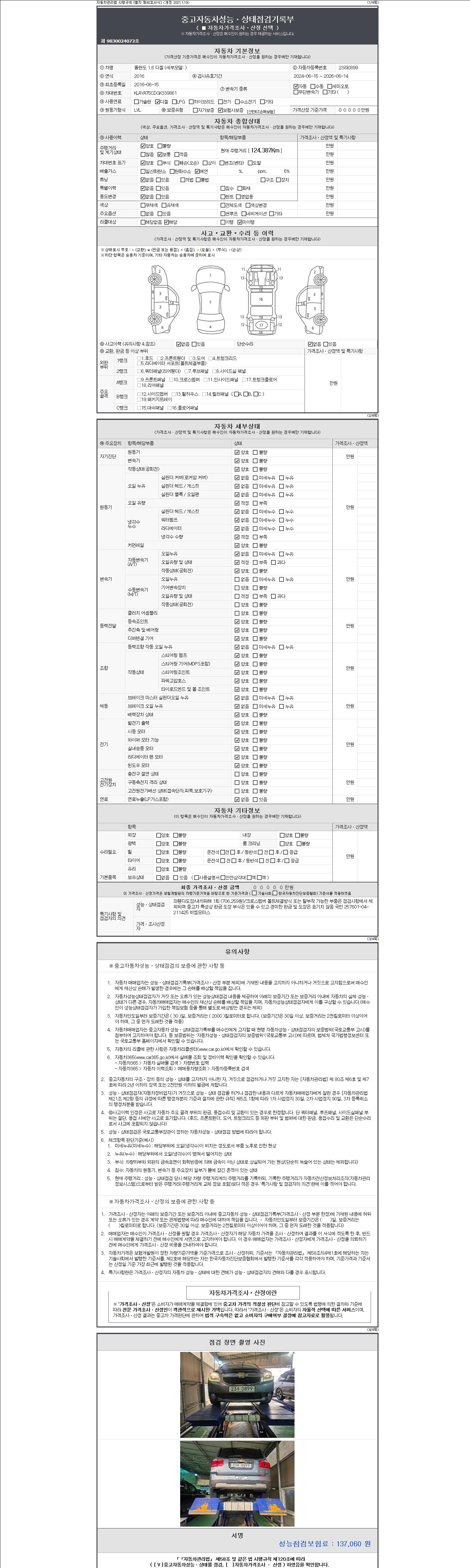 | 주행거리 | 124,387 km | 차량번호 | 23라0899 | 사고유무 | 성능기록부 참조 | 제시번호 | 제 2147483647 호 |