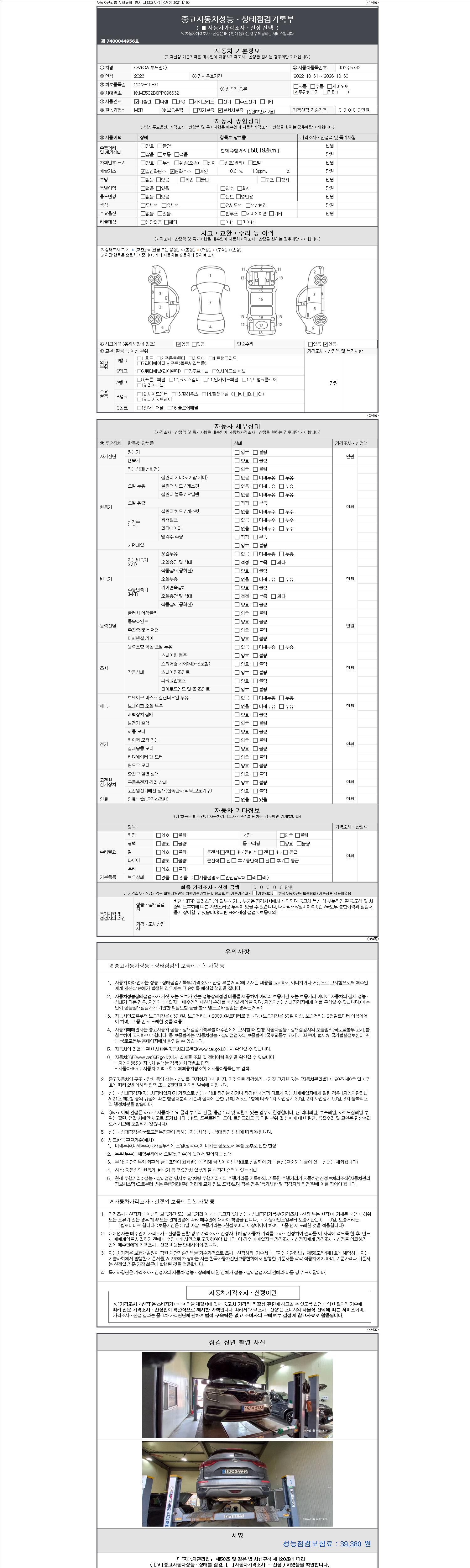 자동차관리법 시행규칙 제120조의 규정에 따라 별지 제 82호서식 《중고자동차 성능, 상태점검 기록부》를 발행한 성능, 상태점검자 및 매매자는 아래의 보증기간 또는 보증거리 이내의 중고자동차, 성능점검 기록부에 기재된 내용과 자동차의 실제 성능, 상태가 다른 경우 계약 또는 관계법령에 따라 매수인에 대하여 책임을 집니다.