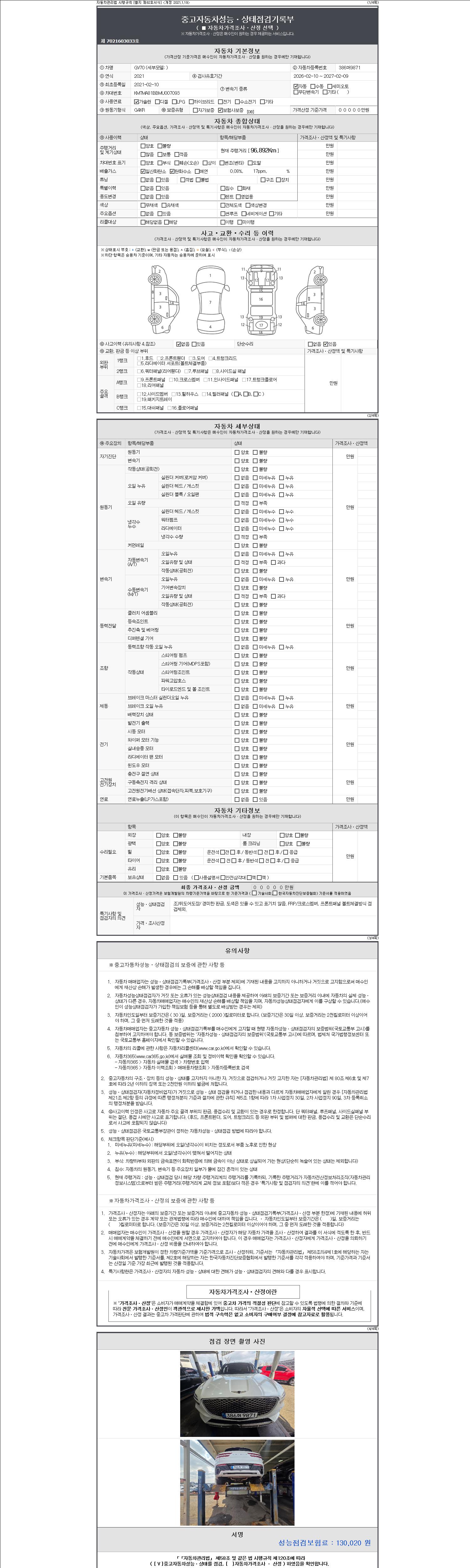 | 주행거리 | 96,892 km | 차량번호 | 386머9871 | 사고유무 | 성능기록부 참조 | 제시번호 | 제 2147483647 호 |