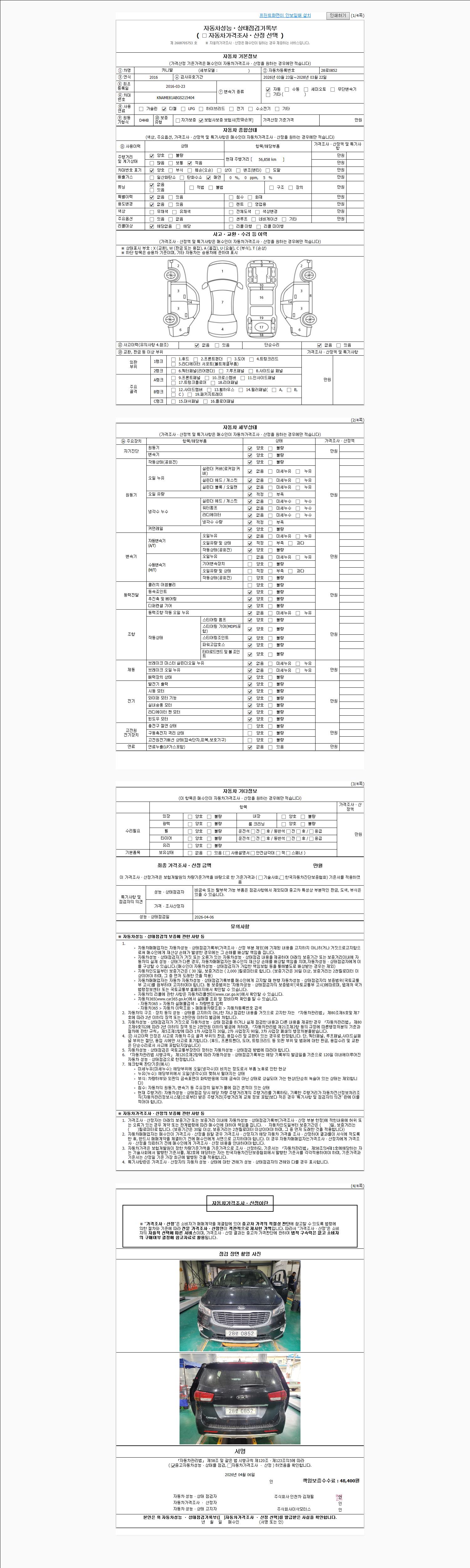 | 주행거리 | 56,858 km | 차량번호 | 28로0852 | 사고유무 | 성능기록부 참조 | 제시번호 | 제 2026017704 호 |