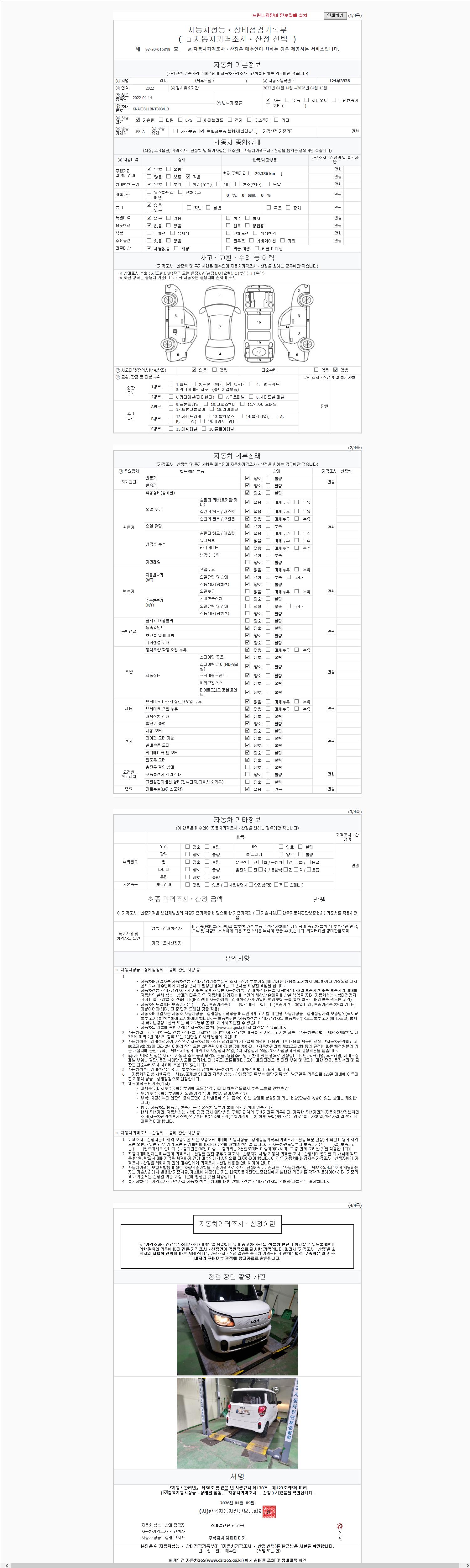 | 주행거리 | 29,392 km | 차량번호 | 124무3936 | 사고유무 | 성능기록부 참조 | 제시번호 | 제 2026045923 호 |