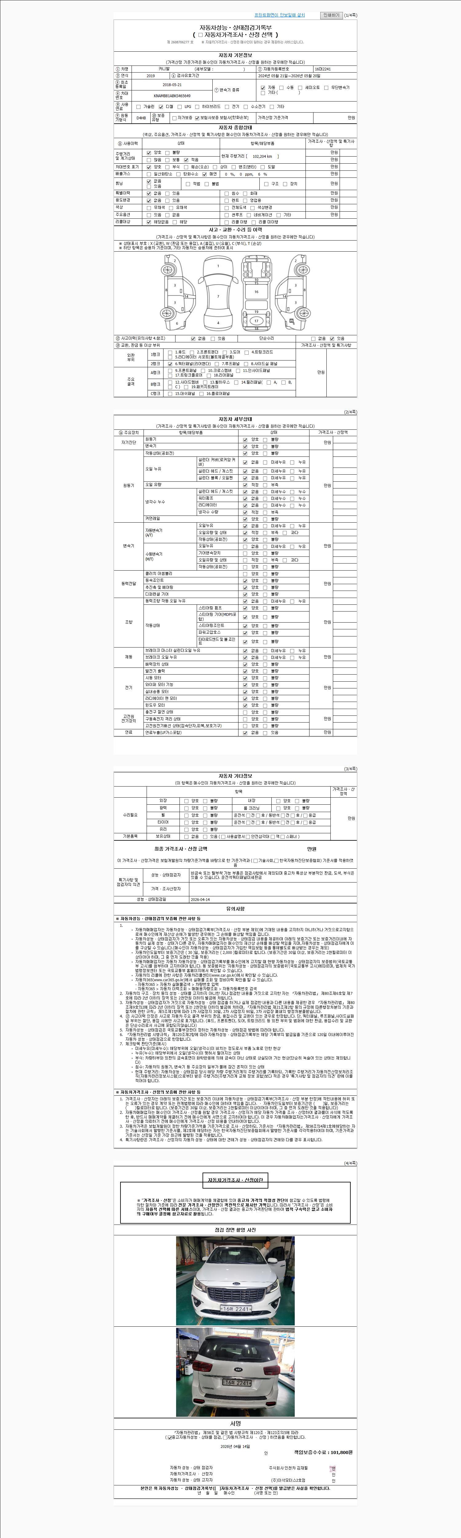 | 주행거리 | 102,204 km | 차량번호 | 16머2241 | 사고유무 | 성능기록부 참조 | 제시번호 | 제 2026019365 호 |