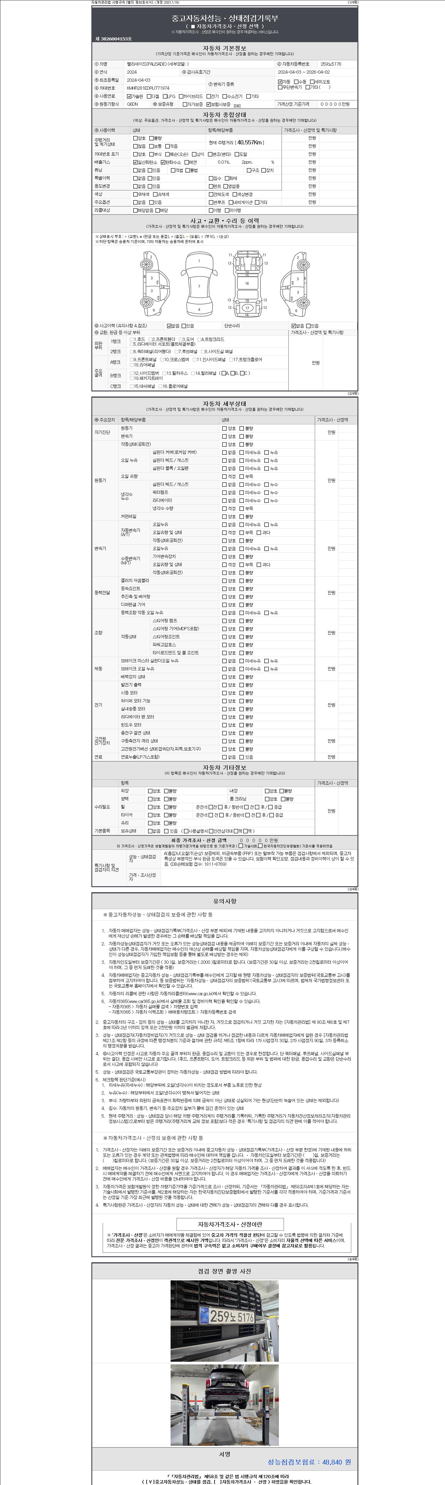 | 주행거리 | 40,557 km | 차량번호 | 259노5176 | 사고유무 | 성능기록부 참조 | 제시번호 | 제 2147483647 호 |
