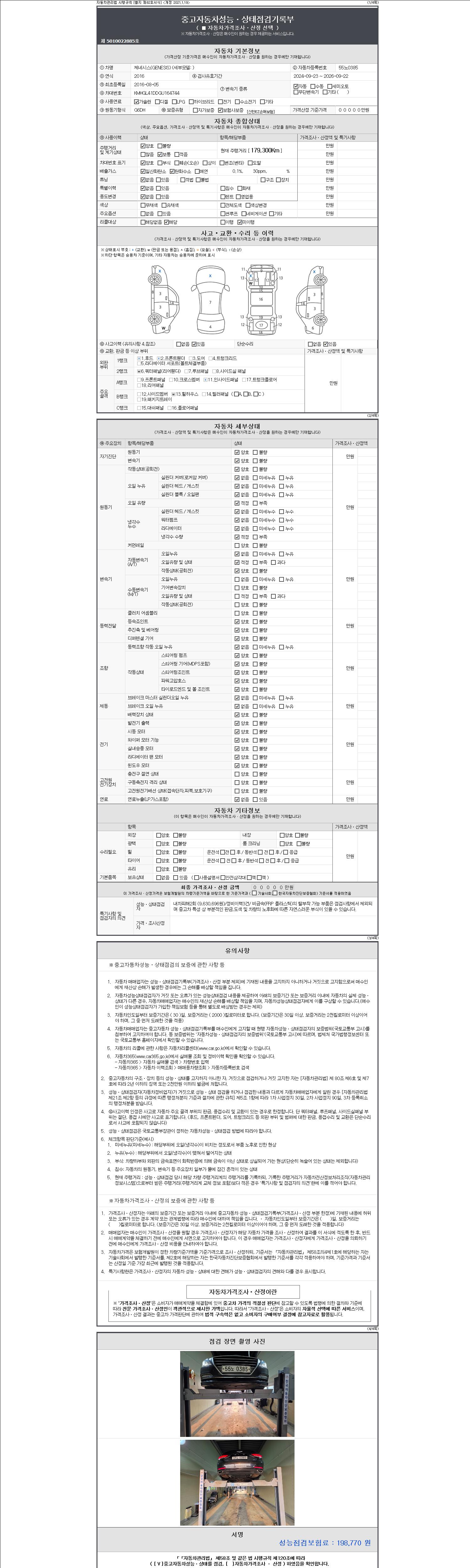 | 주행거리 | 179,300 km | 차량번호 | 55노0385 | 사고유무 | 성능기록부 참조 | 제시번호 | 제 2147483647 호 |