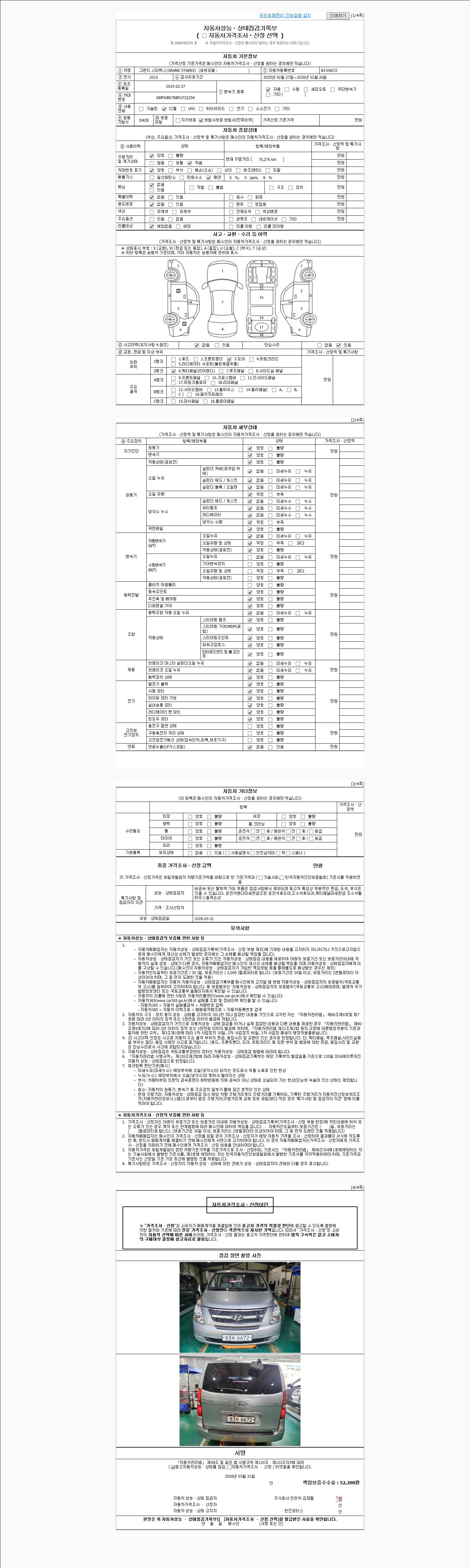 | 주행거리 | 70,276 km | 차량번호 | 83서6672 | 사고유무 | 성능기록부 참조 | 제시번호 | 제 2026005318 호 |