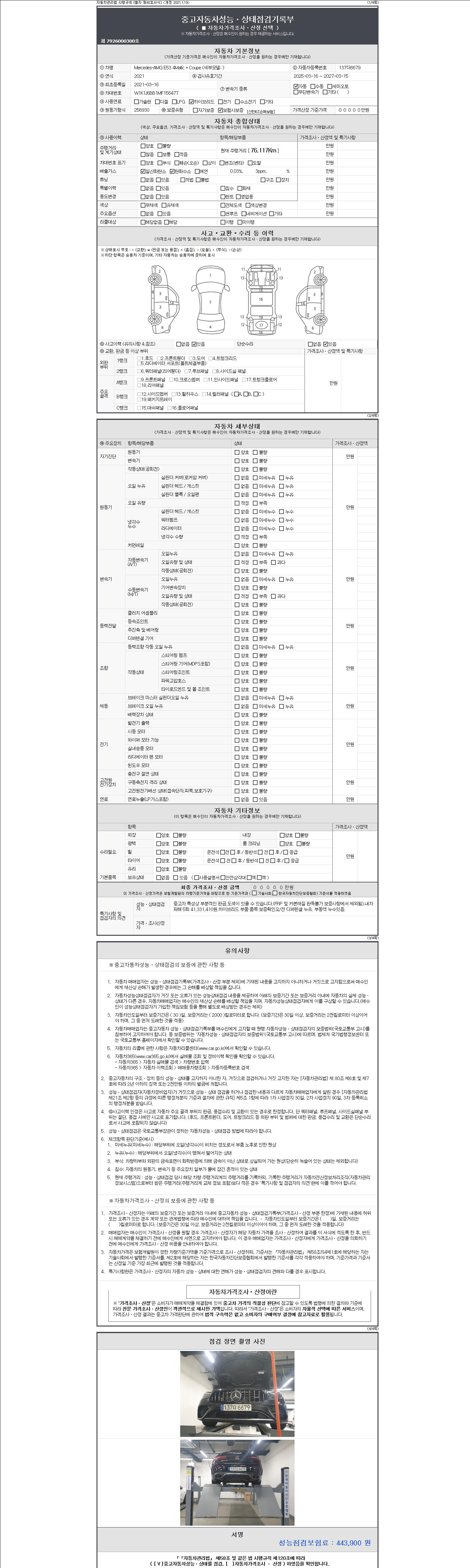 자동차관리법 시행규칙 제120조의 규정에 따라 별지 제 82호서식 《중고자동차 성능, 상태점검 기록부》를 발행한 성능, 상태점검자 및 매매자는 아래의 보증기간 또는 보증거리 이내의 중고자동차, 성능점검 기록부에 기재된 내용과 자동차의 실제 성능, 상태가 다른 경우 계약 또는 관계법령에 따라 매수인에 대하여 책임을 집니다.