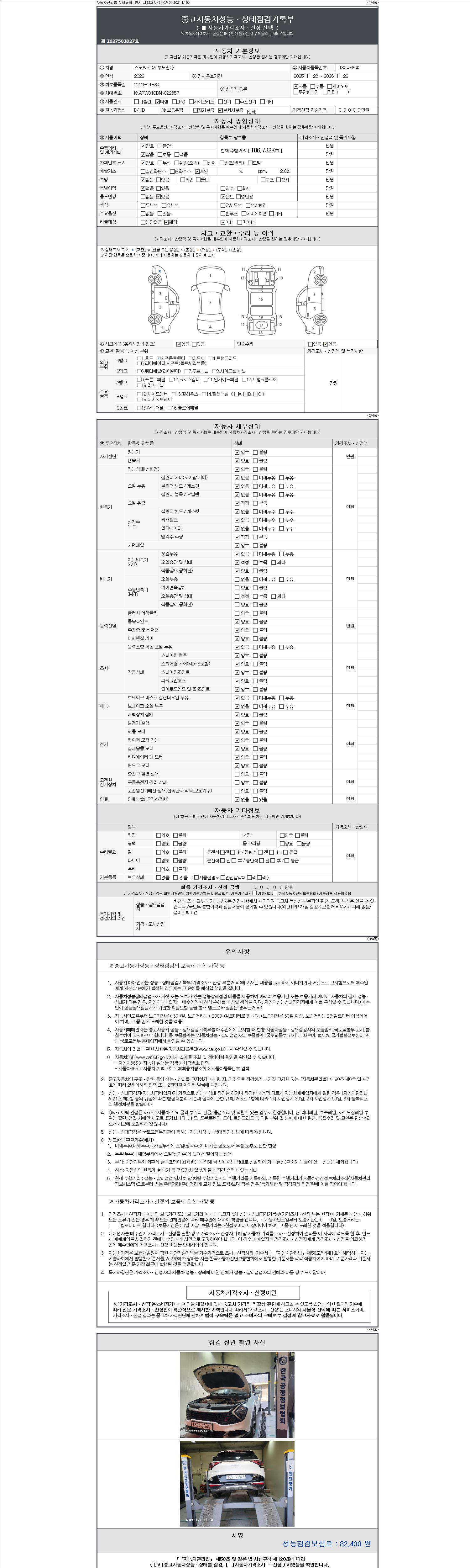 자동차관리법 시행규칙 제120조의 규정에 따라 별지 제 82호서식 《중고자동차 성능, 상태점검 기록부》를 발행한 성능, 상태점검자 및 매매자는 아래의 보증기간 또는 보증거리 이내의 중고자동차, 성능점검 기록부에 기재된 내용과 자동차의 실제 성능, 상태가 다른 경우 계약 또는 관계법령에 따라 매수인에 대하여 책임을 집니다.