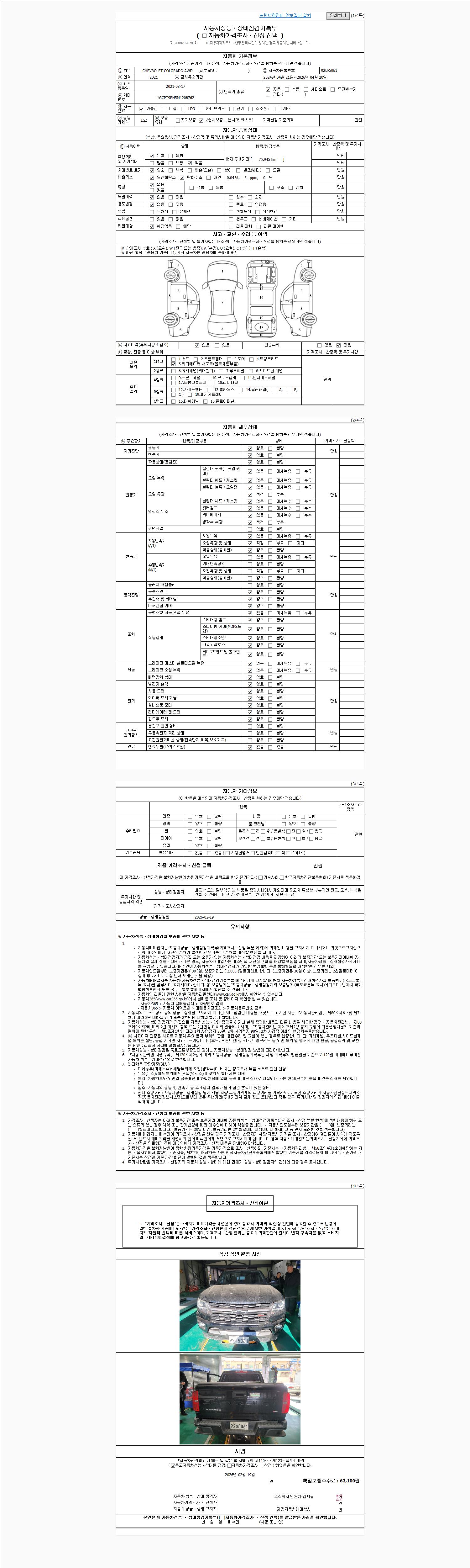 | 주행거리 | 75,945 km | 차량번호 | 92마5061 | 사고유무 | 성능기록부 참조 | 제시번호 | 제 2026006305 호 |