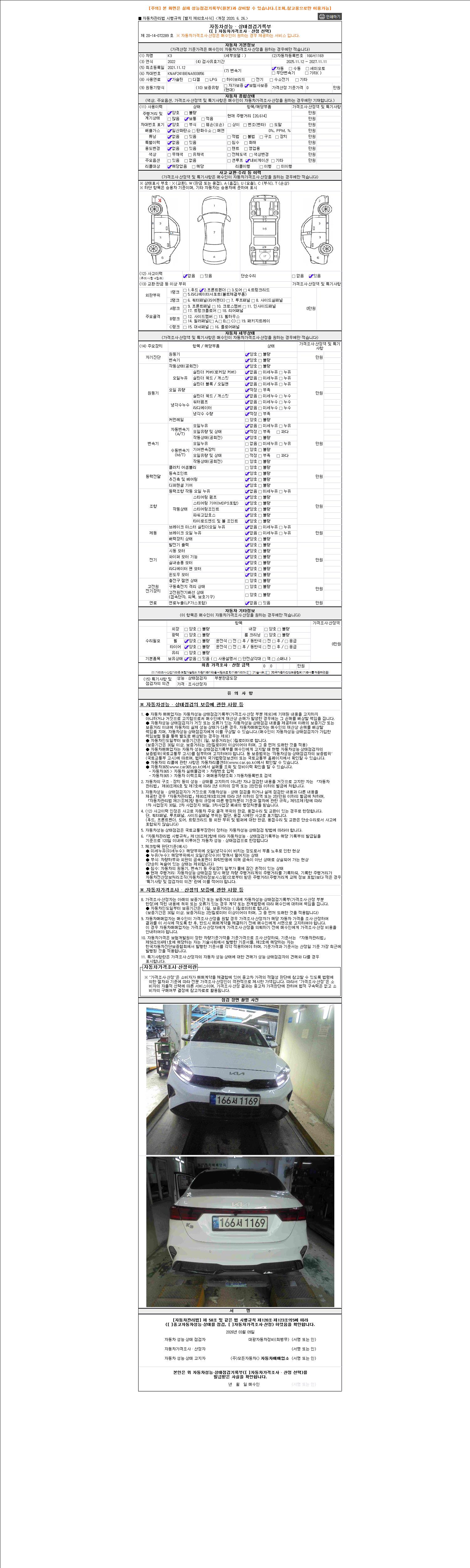 | 주행거리 | 20,626 km | 차량번호 | 166서1169 | 사고유무 | 성능기록부 참조 | 제시번호 | 제 2026029860 호 |