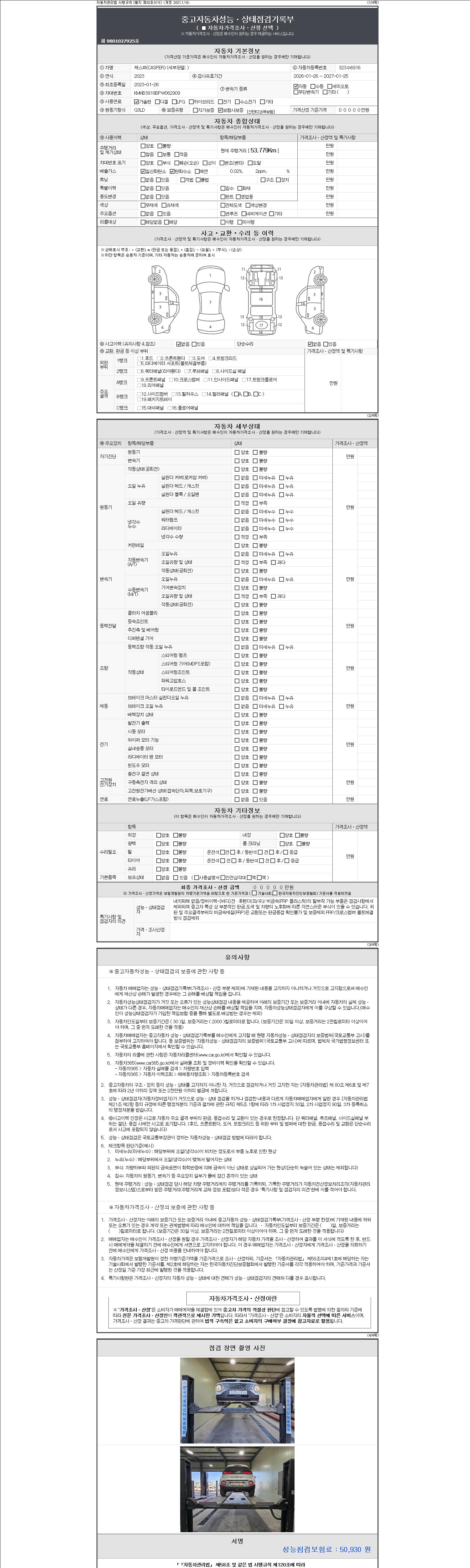 | 주행거리 | 53,779 km | 차량번호 | 323수6916 | 사고유무 | 성능기록부 참조 | 제시번호 | 제 2147483647 호 |