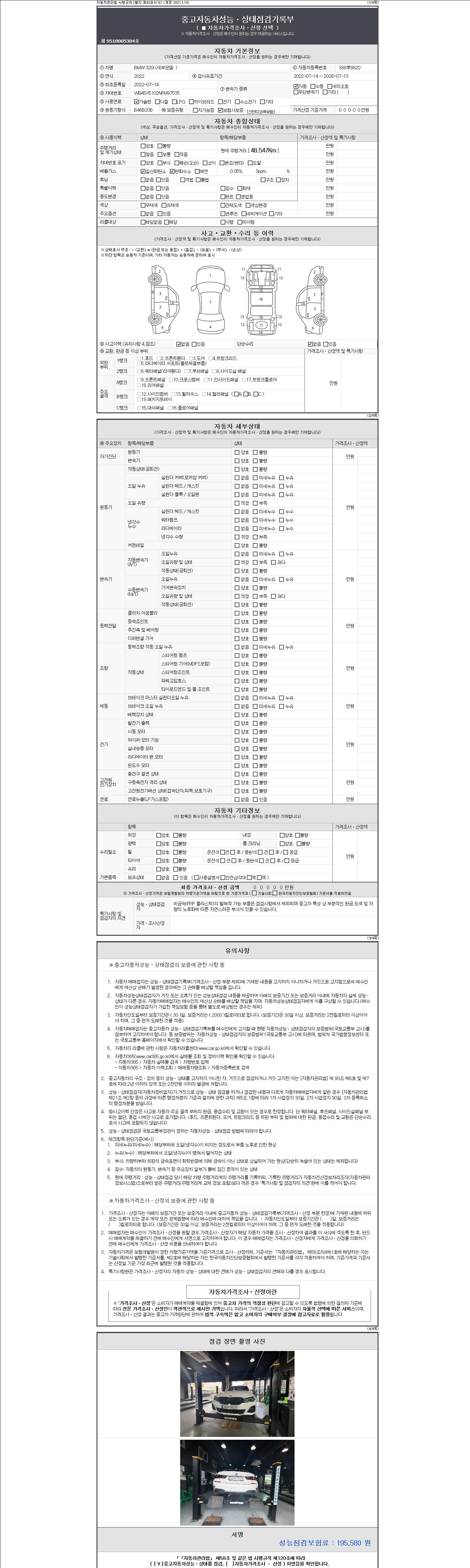 자동차관리법 시행규칙 제120조의 규정에 따라 별지 제 82호서식 《중고자동차 성능, 상태점검 기록부》를 발행한 성능, 상태점검자 및 매매자는 아래의 보증기간 또는 보증거리 이내의 중고자동차, 성능점검 기록부에 기재된 내용과 자동차의 실제 성능, 상태가 다른 경우 계약 또는 관계법령에 따라 매수인에 대하여 책임을 집니다.