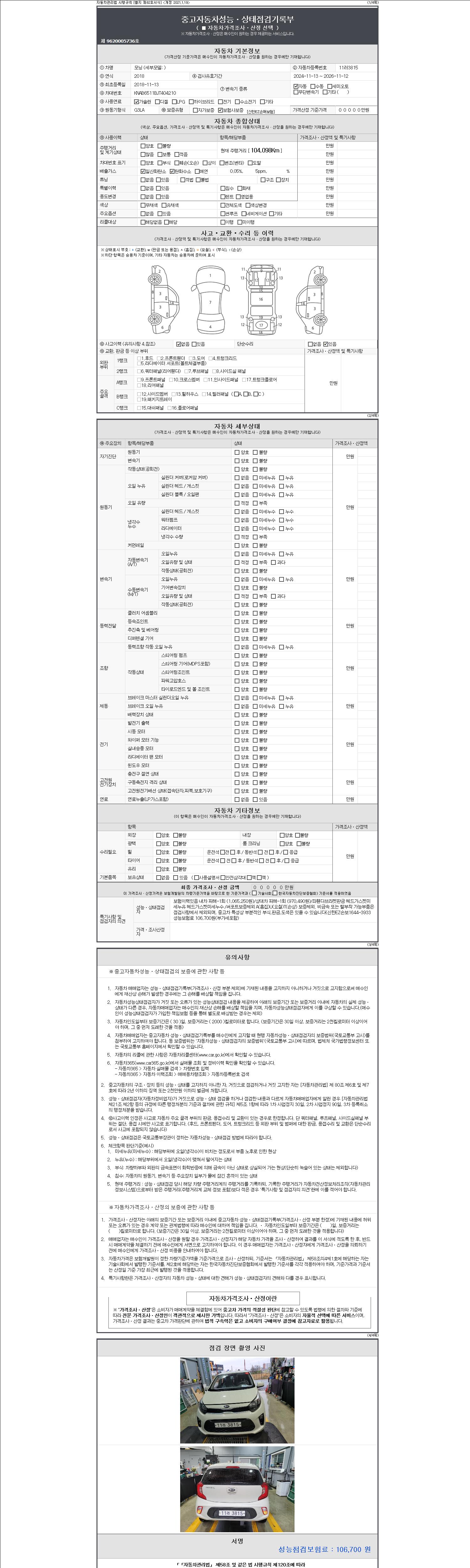 | 주행거리 | 104,098 km | 차량번호 | 11러3815 | 사고유무 | 성능기록부 참조 | 제시번호 | 제 2147483647 호 |