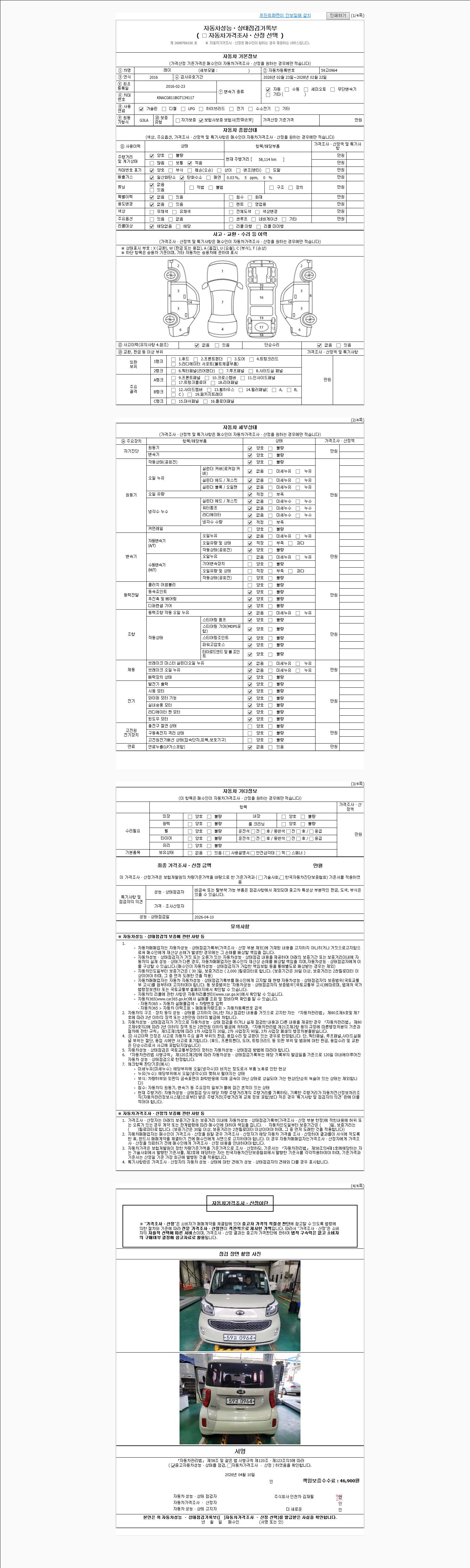 | 주행거리 | 58,109 km | 차량번호 | 59고0964 | 사고유무 | 성능기록부 참조 | 제시번호 | 제 2026018954 호 |