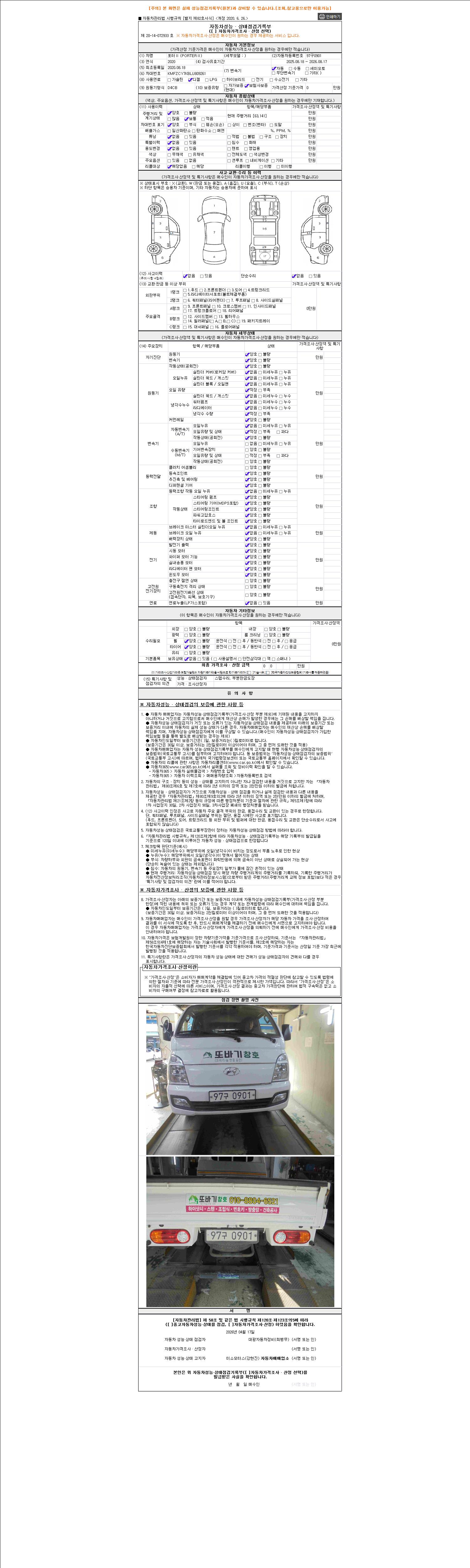자동차관리법 시행규칙 제120조의 규정에 따라 별지 제 82호서식 《중고자동차 성능, 상태점검 기록부》를 발행한 성능, 상태점검자 및 매매자는 아래의 보증기간 또는 보증거리 이내의 중고자동차, 성능점검 기록부에 기재된 내용과 자동차의 실제 성능, 상태가 다른 경우 계약 또는 관계법령에 따라 매수인에 대하여 책임을 집니다.