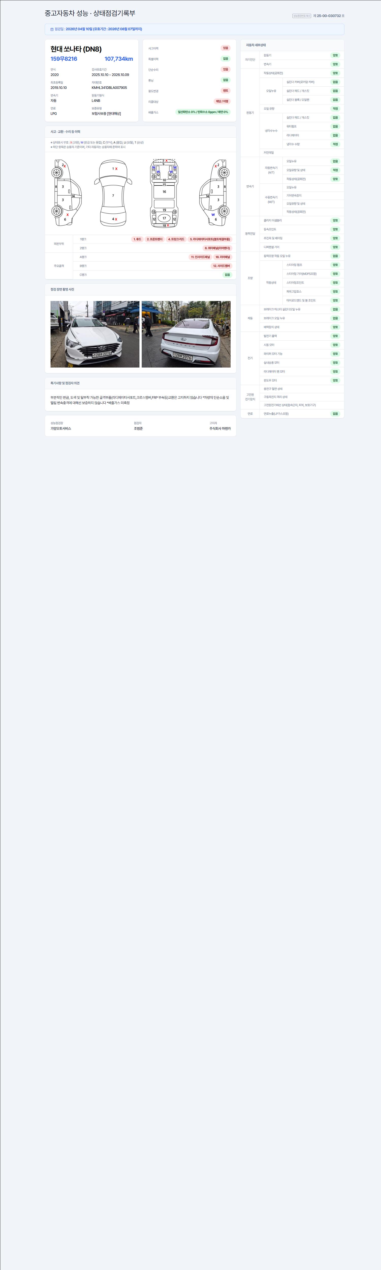 | 주행거리 | 107,734 km | 차량번호 | 159무8216 | 사고유무 | 성능기록부 참조 | 제시번호 | 제 2147483647 호 |