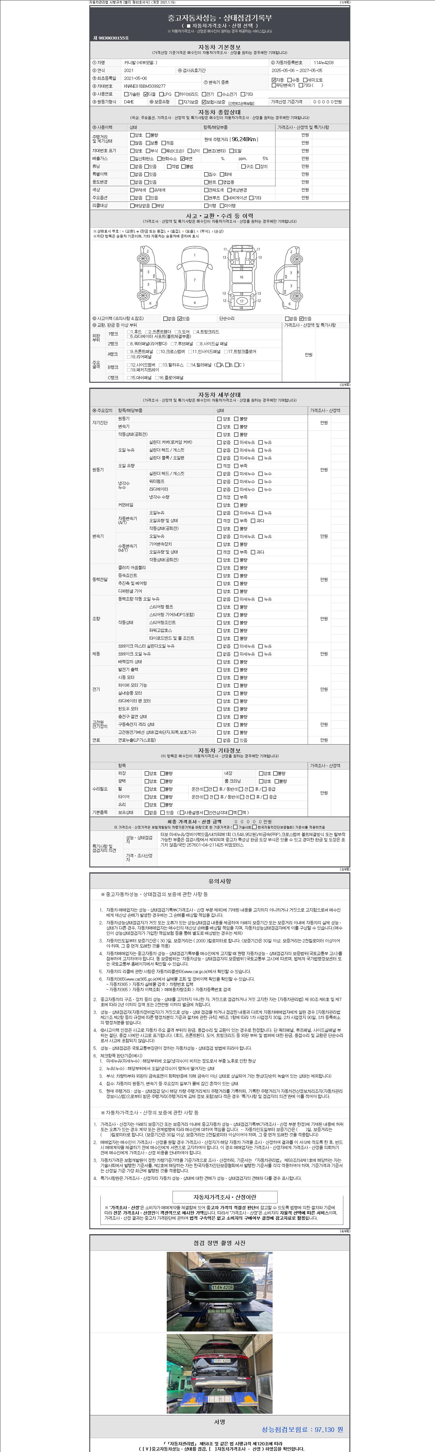 | 주행거리 | 96,248 km | 차량번호 | 114누4208 | 사고유무 | 성능기록부 참조 | 제시번호 | 제 2147483647 호 |