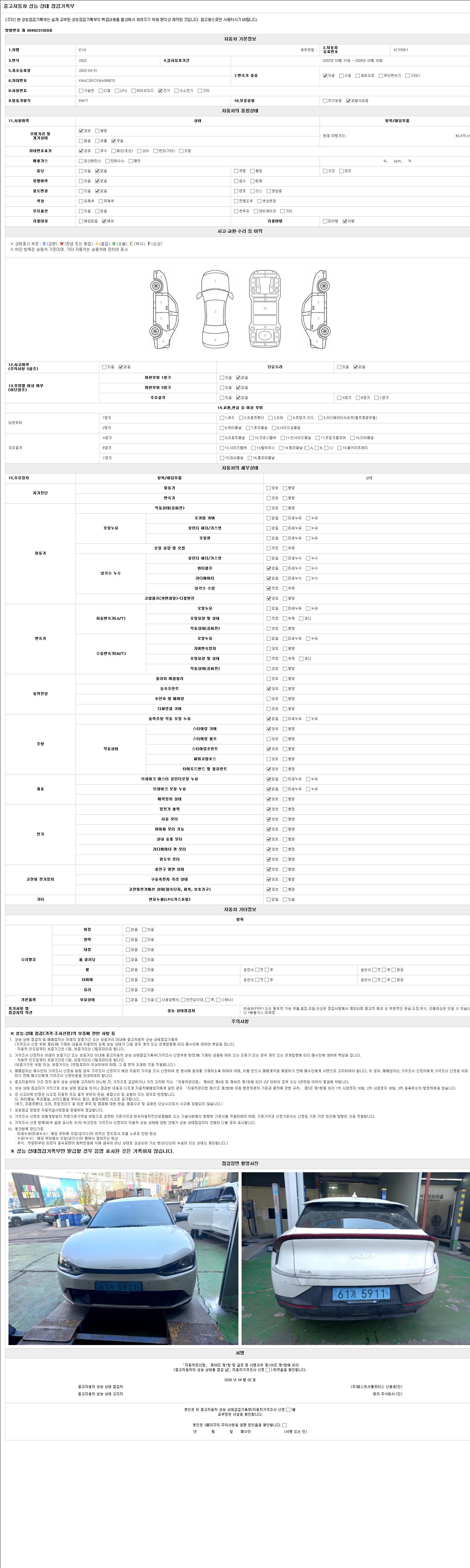 | 주행거리 | 40,475 km | 차량번호 | 61가5911 | 사고유무 | 성능기록부 참조 | 제시번호 | 제 2026012291 호 |