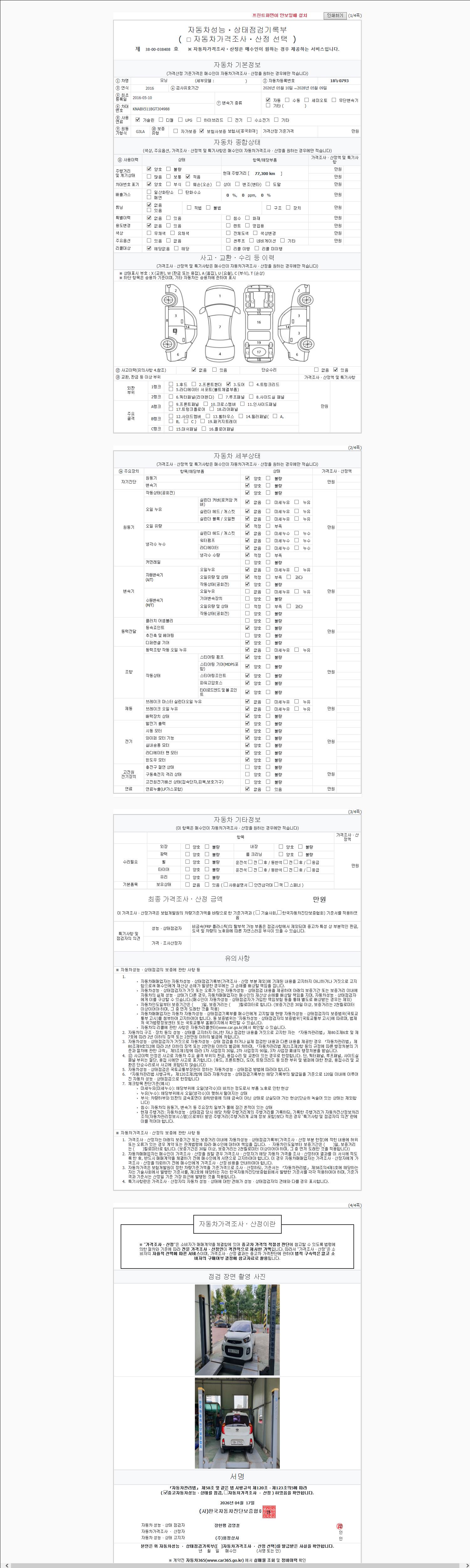 | 주행거리 | 77,300 km | 차량번호 | 18누0793 | 사고유무 | 성능기록부 참조 | 제시번호 | 제 2147483647 호 |