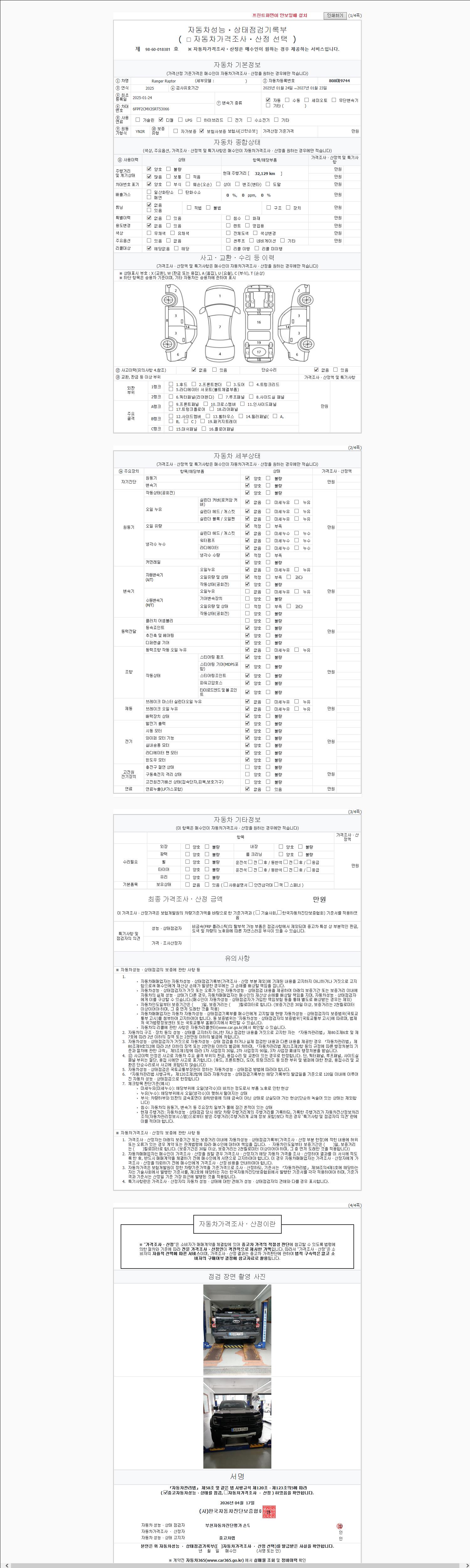 자동차관리법 시행규칙 제120조의 규정에 따라 별지 제 82호서식 《중고자동차 성능, 상태점검 기록부》를 발행한 성능, 상태점검자 및 매매자는 아래의 보증기간 또는 보증거리 이내의 중고자동차, 성능점검 기록부에 기재된 내용과 자동차의 실제 성능, 상태가 다른 경우 계약 또는 관계법령에 따라 매수인에 대하여 책임을 집니다.