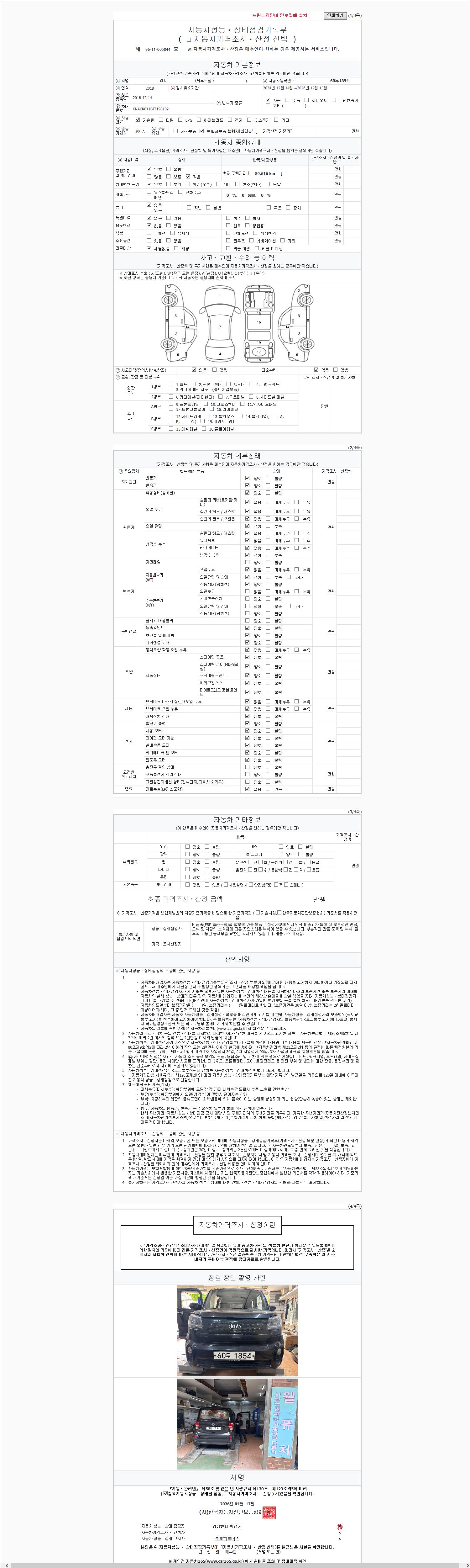 | 주행거리 | 89,616 km | 차량번호 | 60두1854 | 사고유무 | 성능기록부 참조 | 제시번호 | 제 2026049484 호 |