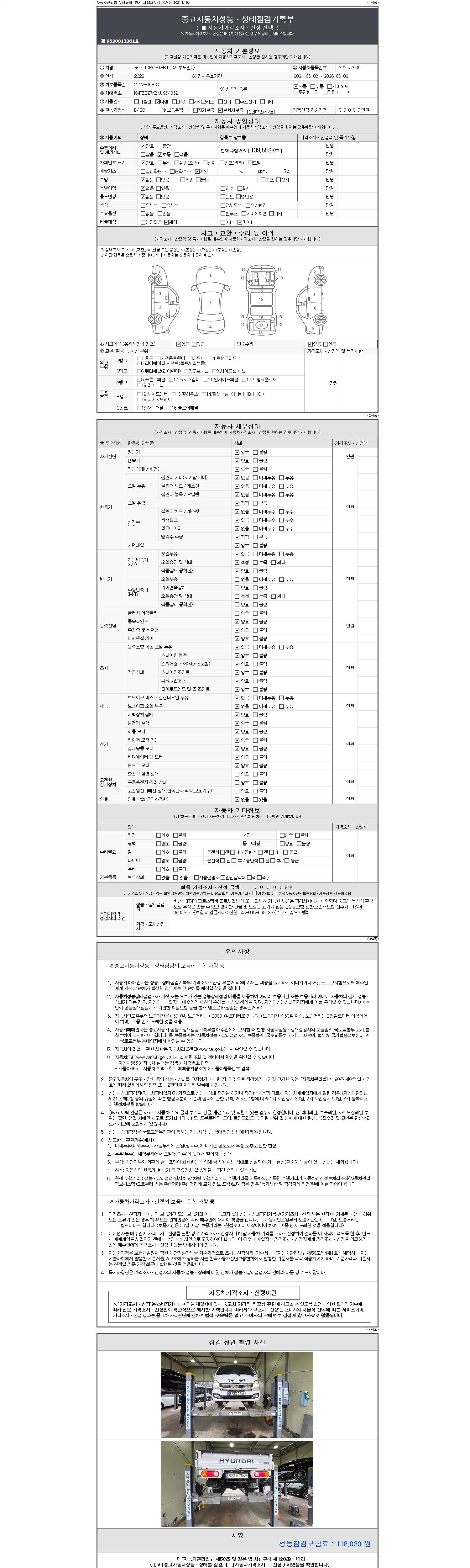 자동차관리법 시행규칙 제120조의 규정에 따라 별지 제 82호서식 《중고자동차 성능, 상태점검 기록부》를 발행한 성능, 상태점검자 및 매매자는 아래의 보증기간 또는 보증거리 이내의 중고자동차, 성능점검 기록부에 기재된 내용과 자동차의 실제 성능, 상태가 다른 경우 계약 또는 관계법령에 따라 매수인에 대하여 책임을 집니다.