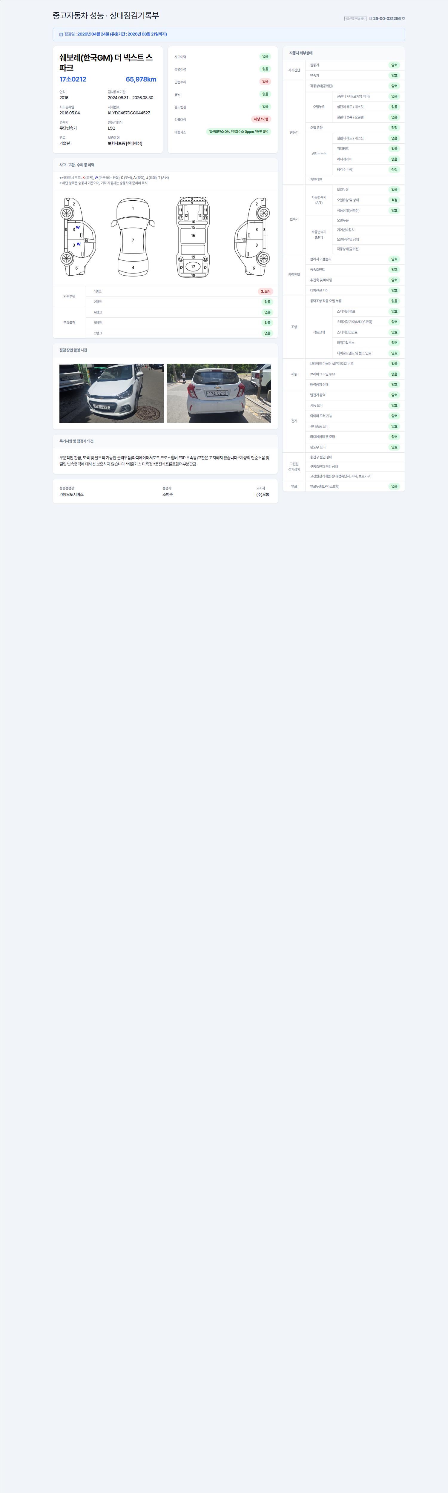 | 주행거리 | 65,978 km | 차량번호 | 17소0212 | 사고유무 | 성능기록부 참조 | 제시번호 | 제 2026051722 호 |
