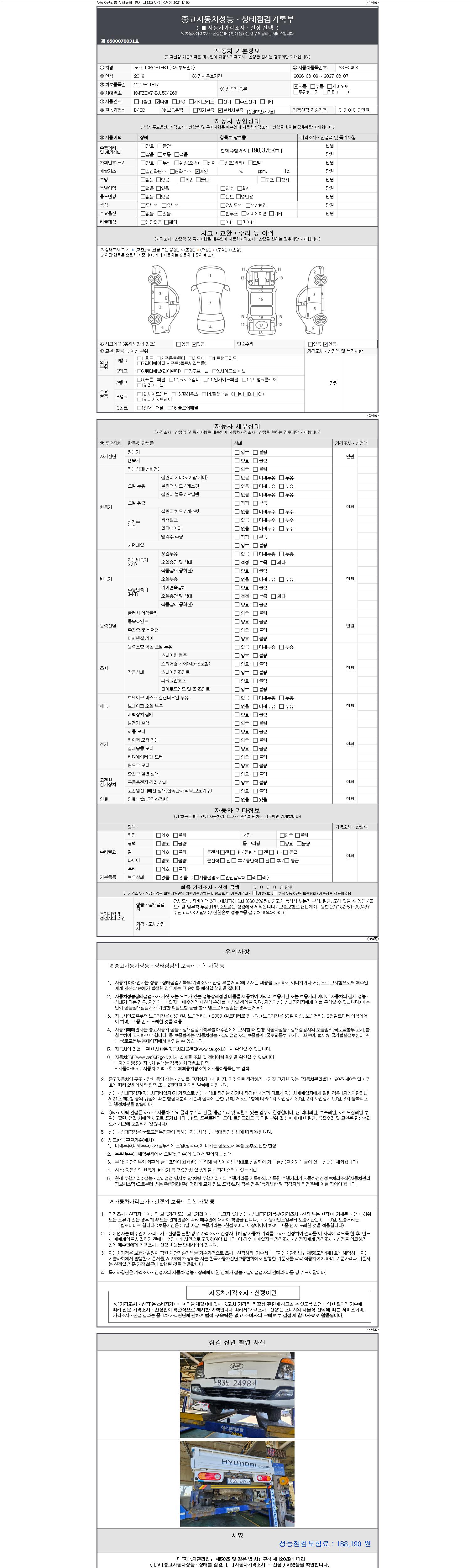 | 주행거리 | 190,293 km | 차량번호 | 83노2498 | 사고유무 | 성능기록부 참조 | 제시번호 | 제 2147483647 호 |
