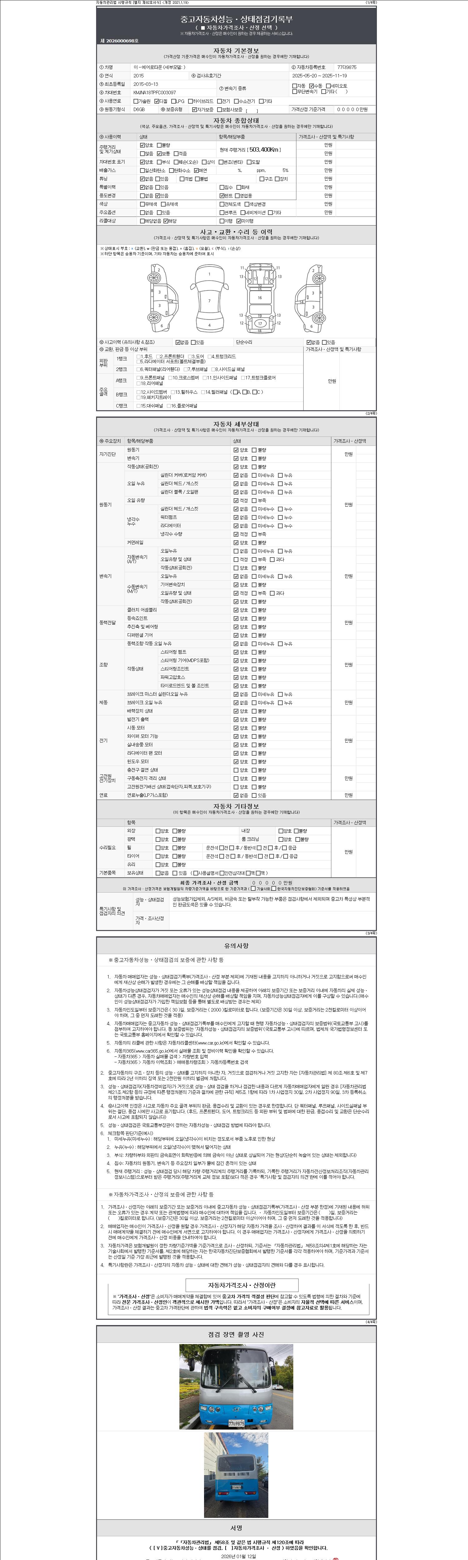 자동차관리법 시행규칙 제120조의 규정에 따라 별지 제 82호서식 《중고자동차 성능, 상태점검 기록부》를 발행한 성능, 상태점검자 및 매매자는 아래의 보증기간 또는 보증거리 이내의 중고자동차, 성능점검 기록부에 기재된 내용과 자동차의 실제 성능, 상태가 다른 경우 계약 또는 관계법령에 따라 매수인에 대하여 책임을 집니다.