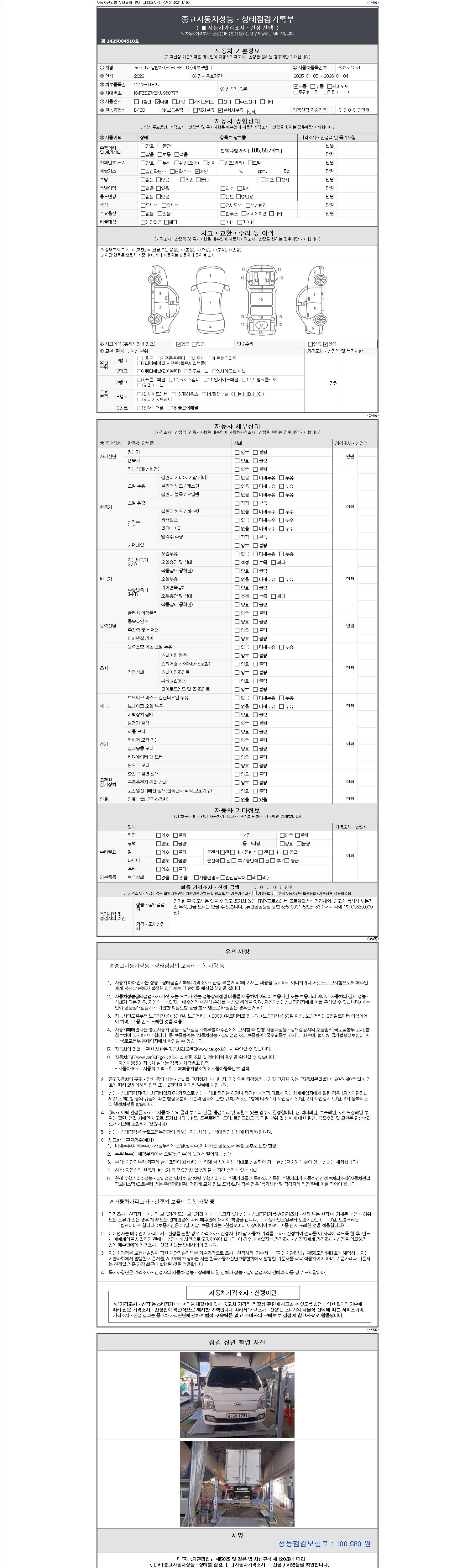 | 주행거리 | 105,557 km | 차량번호 | 833로1251 | 사고유무 | 성능기록부 참조 | 제시번호 | 제 2147483647 호 |