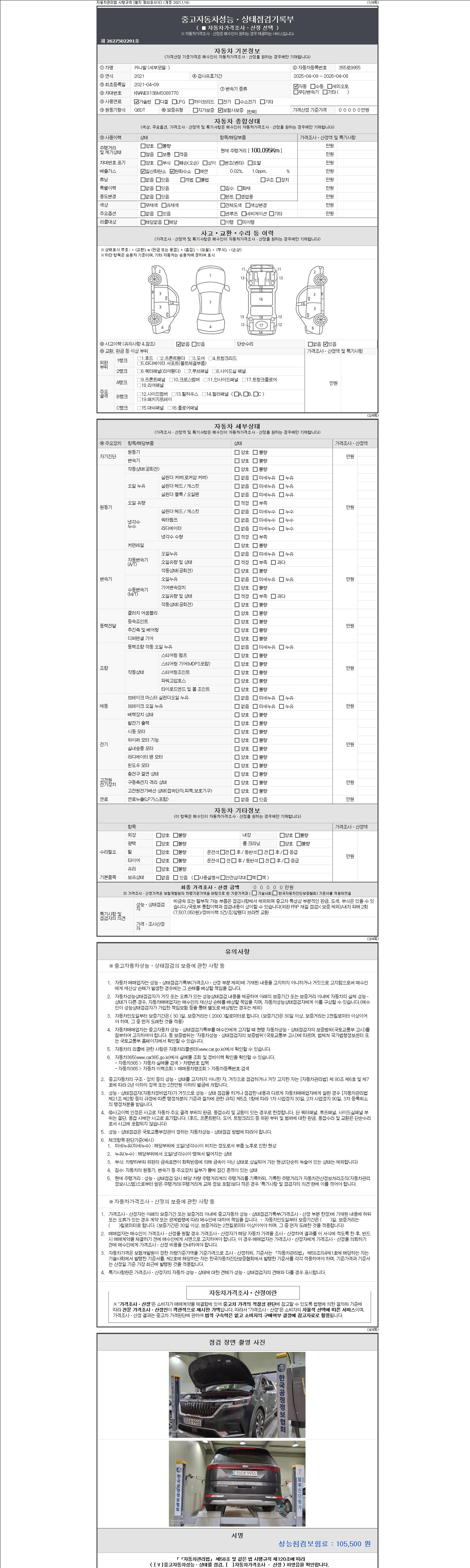 자동차관리법 시행규칙 제120조의 규정에 따라 별지 제 82호서식 《중고자동차 성능, 상태점검 기록부》를 발행한 성능, 상태점검자 및 매매자는 아래의 보증기간 또는 보증거리 이내의 중고자동차, 성능점검 기록부에 기재된 내용과 자동차의 실제 성능, 상태가 다른 경우 계약 또는 관계법령에 따라 매수인에 대하여 책임을 집니다.