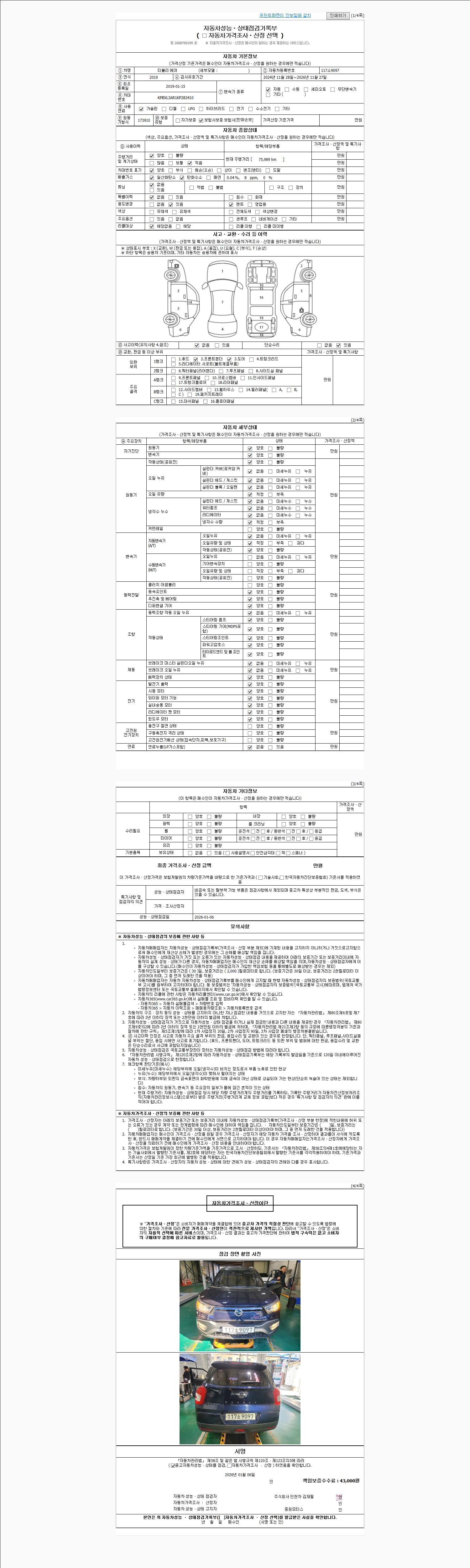 | 주행거리 | 75,989 km | 차량번호 | 117소9097 | 사고유무 | 성능기록부 참조 | 제시번호 | 제 2026000794 호 |