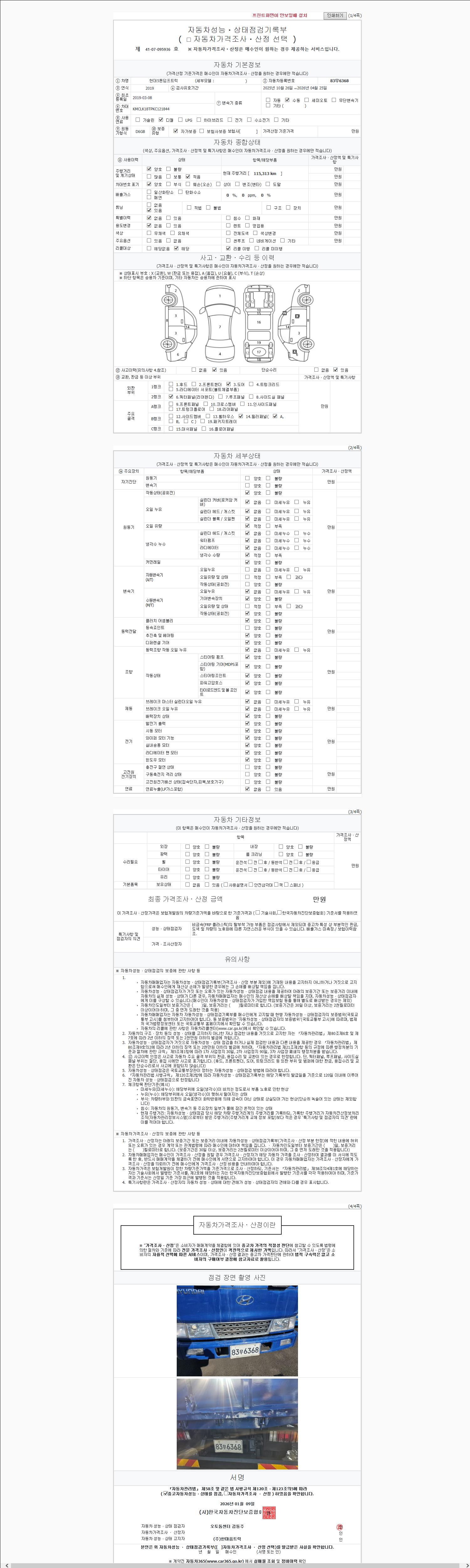 | 주행거리 | 114,954 km | 차량번호 | 83무6368 | 사고유무 | 성능기록부 참조 | 제시번호 | 제 2147483647 호 |