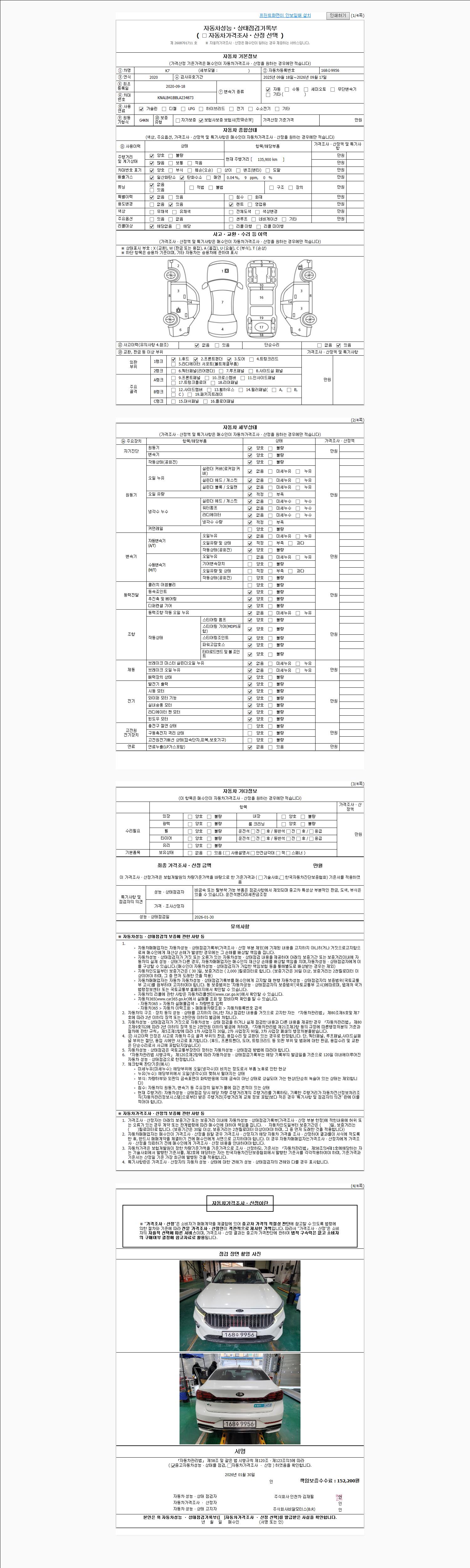 | 주행거리 | 135,898 km | 차량번호 | 168수9956 | 사고유무 | 성능기록부 참조 | 제시번호 | 제 2026006385 호 |
