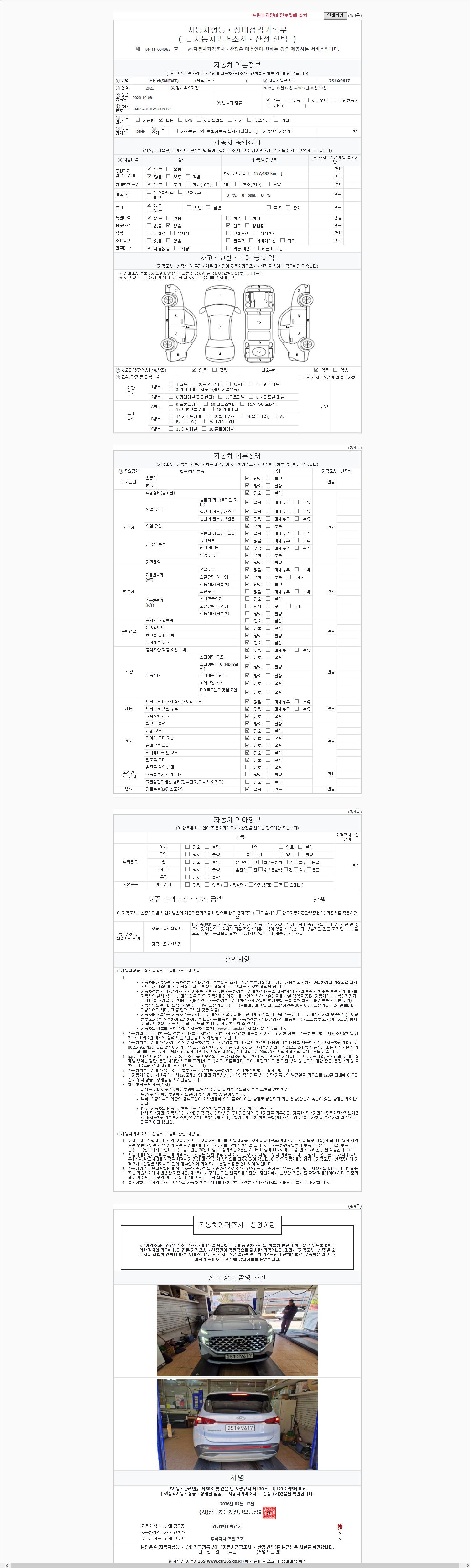 | 주행거리 | 127,482 km | 차량번호 | 251수9617 | 사고유무 | 성능기록부 참조 | 제시번호 | 제 2026017263 호 |