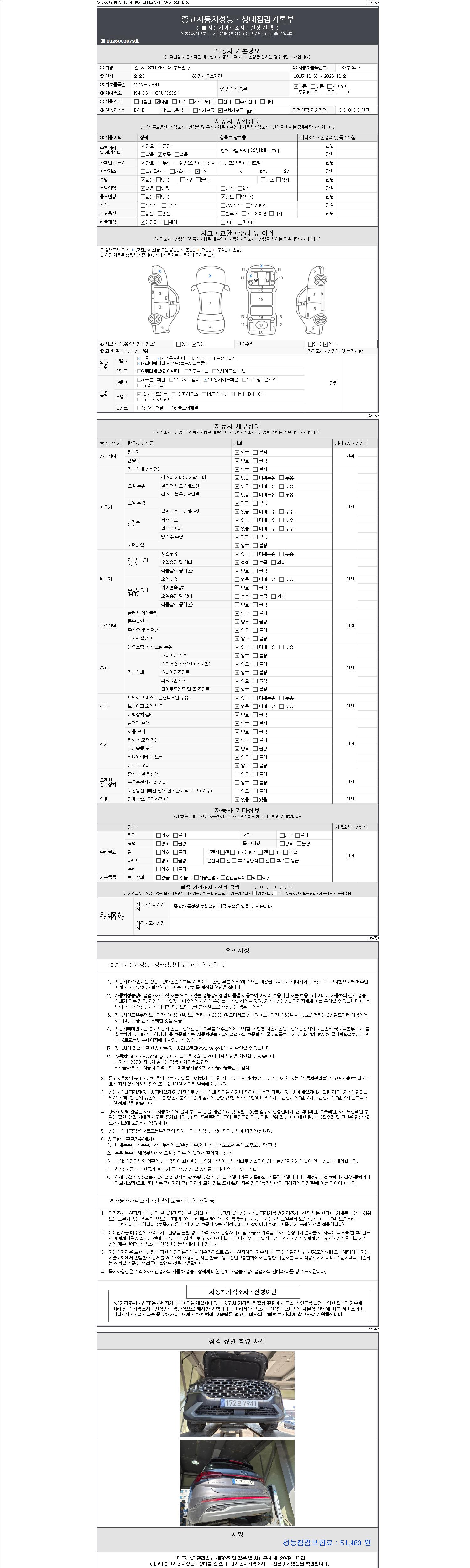 자동차관리법 시행규칙 제120조의 규정에 따라 별지 제 82호서식 《중고자동차 성능, 상태점검 기록부》를 발행한 성능, 상태점검자 및 매매자는 아래의 보증기간 또는 보증거리 이내의 중고자동차, 성능점검 기록부에 기재된 내용과 자동차의 실제 성능, 상태가 다른 경우 계약 또는 관계법령에 따라 매수인에 대하여 책임을 집니다.