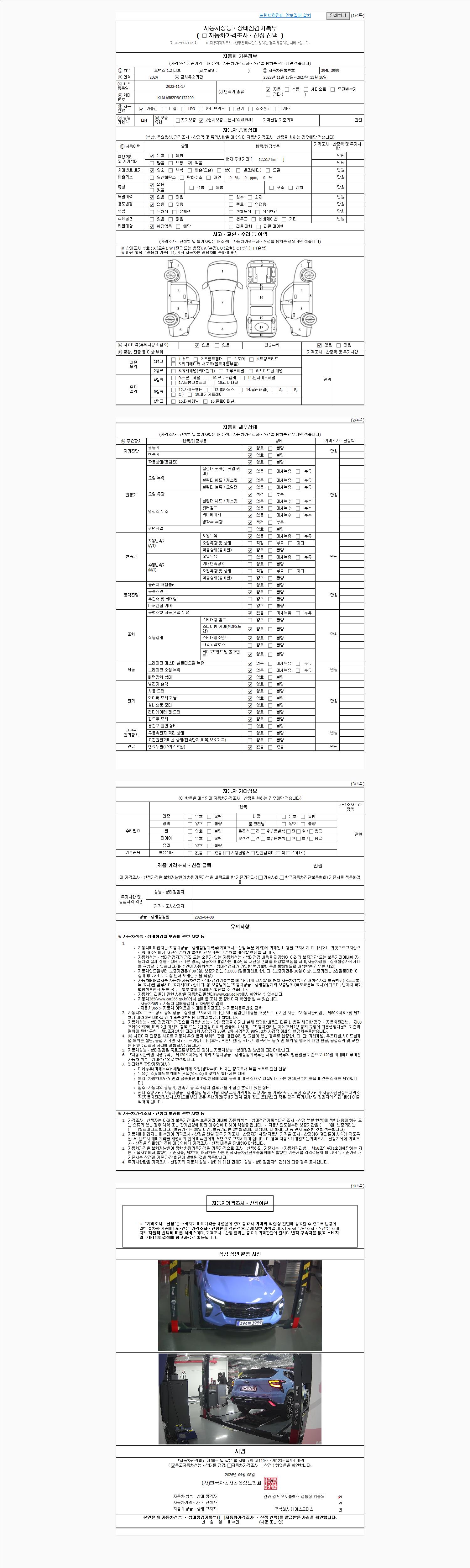 자동차관리법 시행규칙 제120조의 규정에 따라 별지 제 82호서식 《중고자동차 성능, 상태점검 기록부》를 발행한 성능, 상태점검자 및 매매자는 아래의 보증기간 또는 보증거리 이내의 중고자동차, 성능점검 기록부에 기재된 내용과 자동차의 실제 성능, 상태가 다른 경우 계약 또는 관계법령에 따라 매수인에 대하여 책임을 집니다.